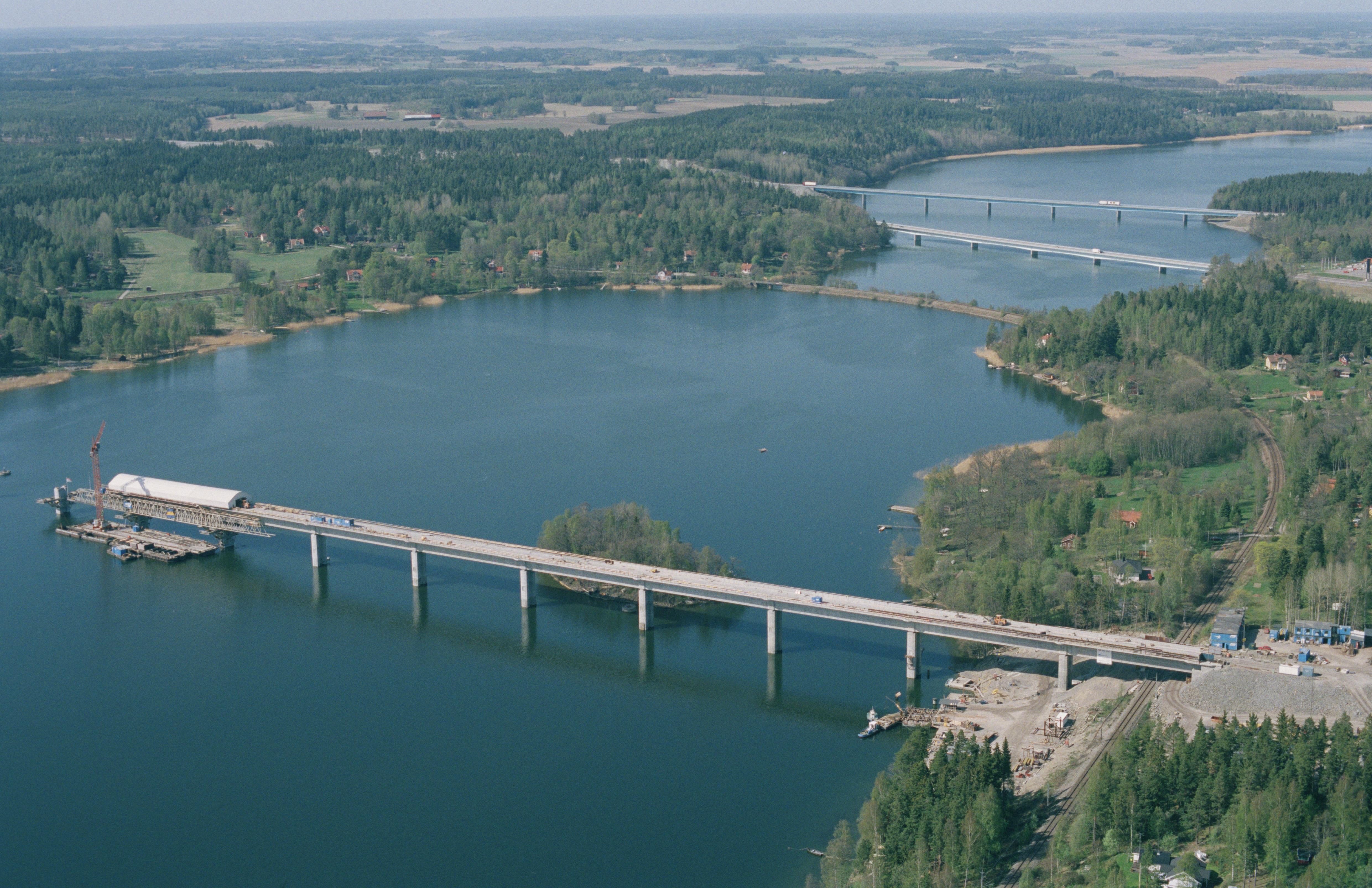 Beskrivning: Broar över Ekolsundsviken. I bildens nedre del bygge av järnvägsbro vid Myrholmen. Uppe till vänster området Ekolsund i socknet Husby-Sjultoft. I bildens högre del Stämsvik i socknet Övergran. Bilden är tagen mot (väderstreck): NV