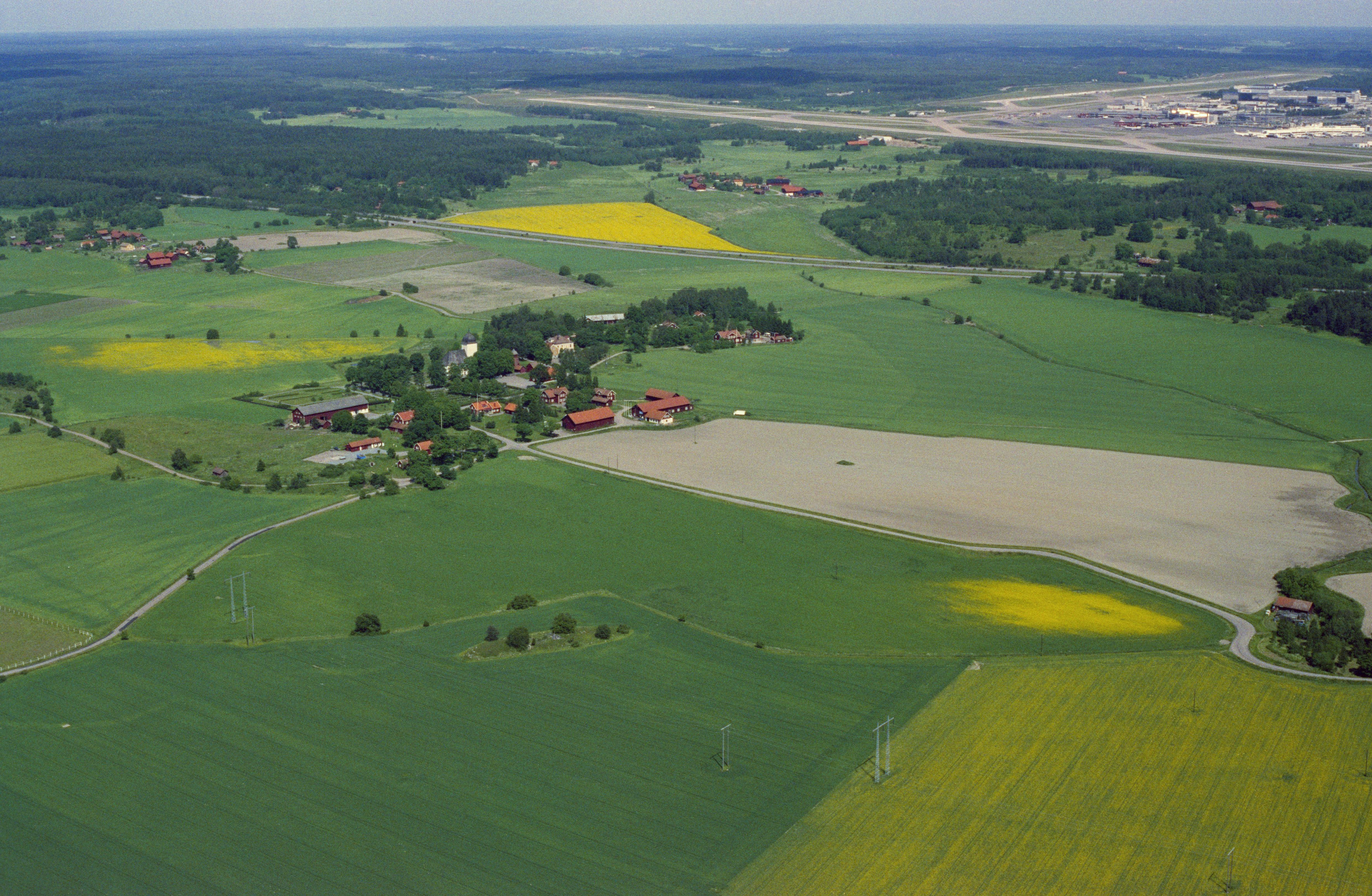 Beskrivning: Husby-Ärlinghundra kyrka i Husby kyrkby. Vid kyrkan gravfält RAÄnr Husby-Ärlinghundra 77:1. Uppe till höger Stockholms flygplats / Stockholm Arlanda Airport. Bilden är tagen mot (väderstreck): NO