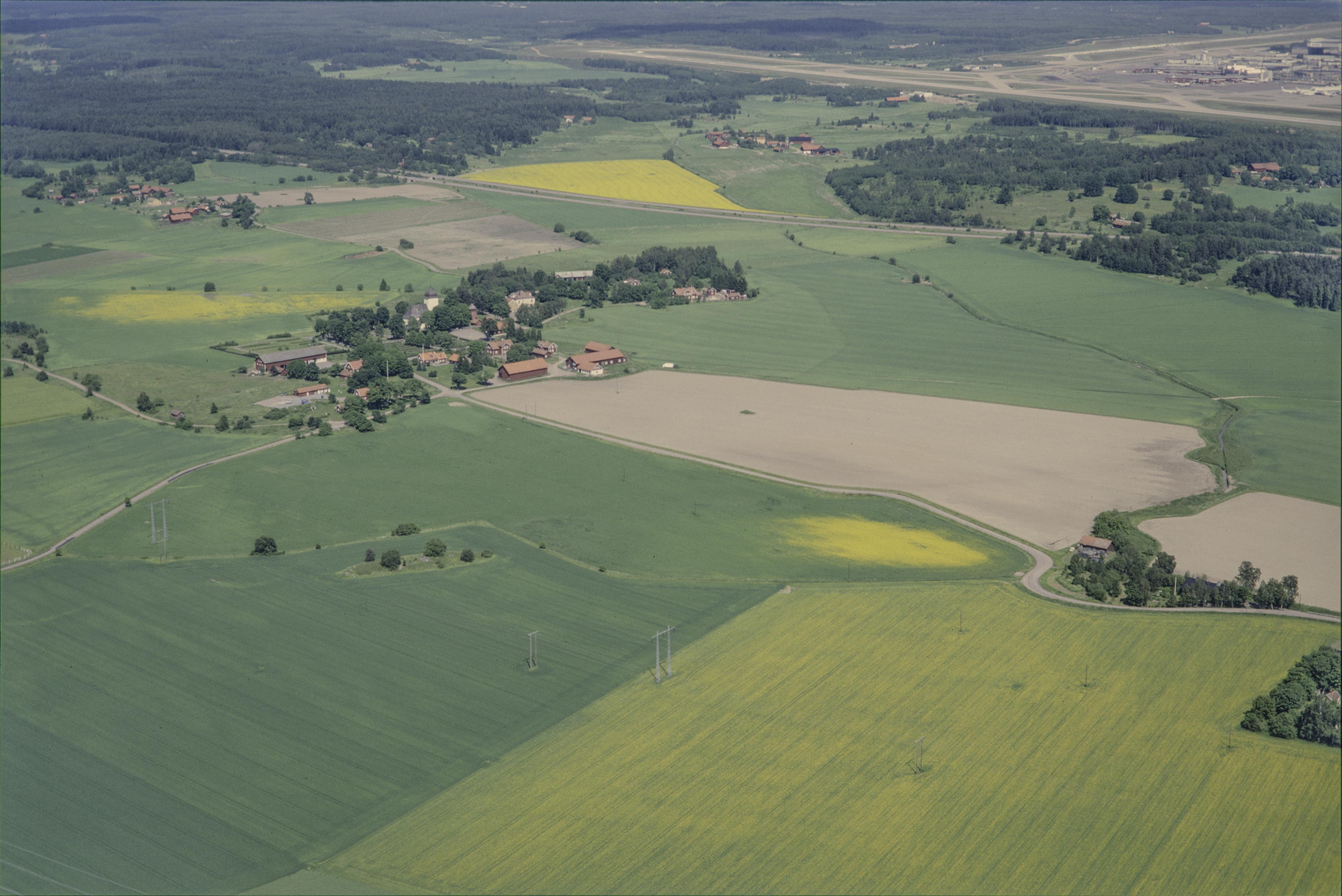 Beskrivning: Husby-Ärlinghundra kyrka i Husby kyrkby. Vid kyrkan gravfält RAÄnr Husby-Ärlinghundra 77:1. Uppe till höger Stockholms flygplats / Stockholm Arlanda Airport. Bilden är tagen mot (väderstreck): NO