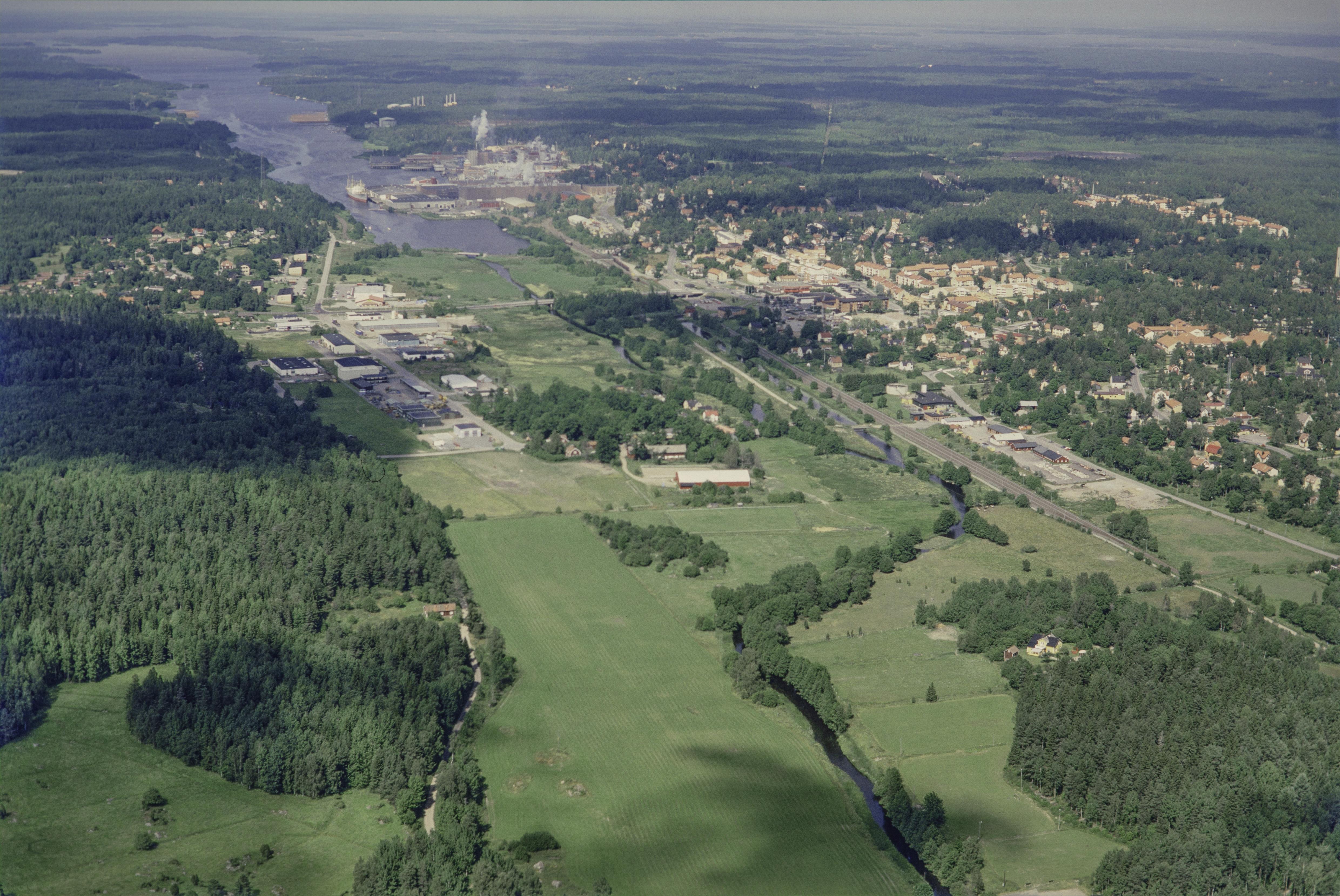 Beskrivning: Vid bildens mitt Skeboåns utlopp i Edeboviken vid pappersbruket i Hallstaviks tätort. Bilden är tagen mot (väderstreck): NNO