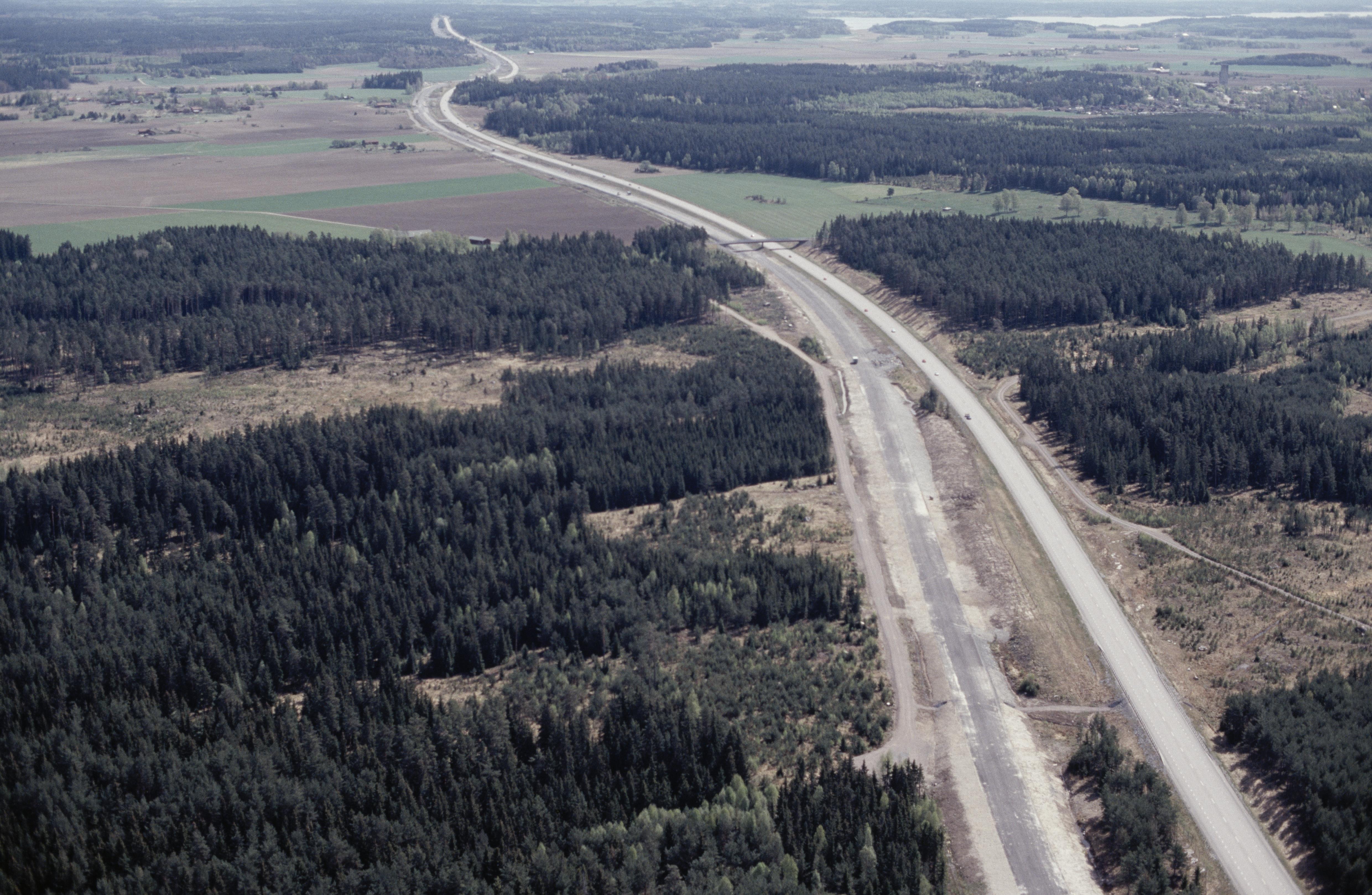 Beskrivning: Arkeologiska undersökningar i samband med bygge av väg E18 genom fornlämningsområden söder om Tibble. I bildens övre del Fiskvik, Knoppbacka och Skäggesta med bl.a. grav- och boplats RAÄnr Litslena 561:1-3. Bilden är tagen mot (väderstreck): OSO