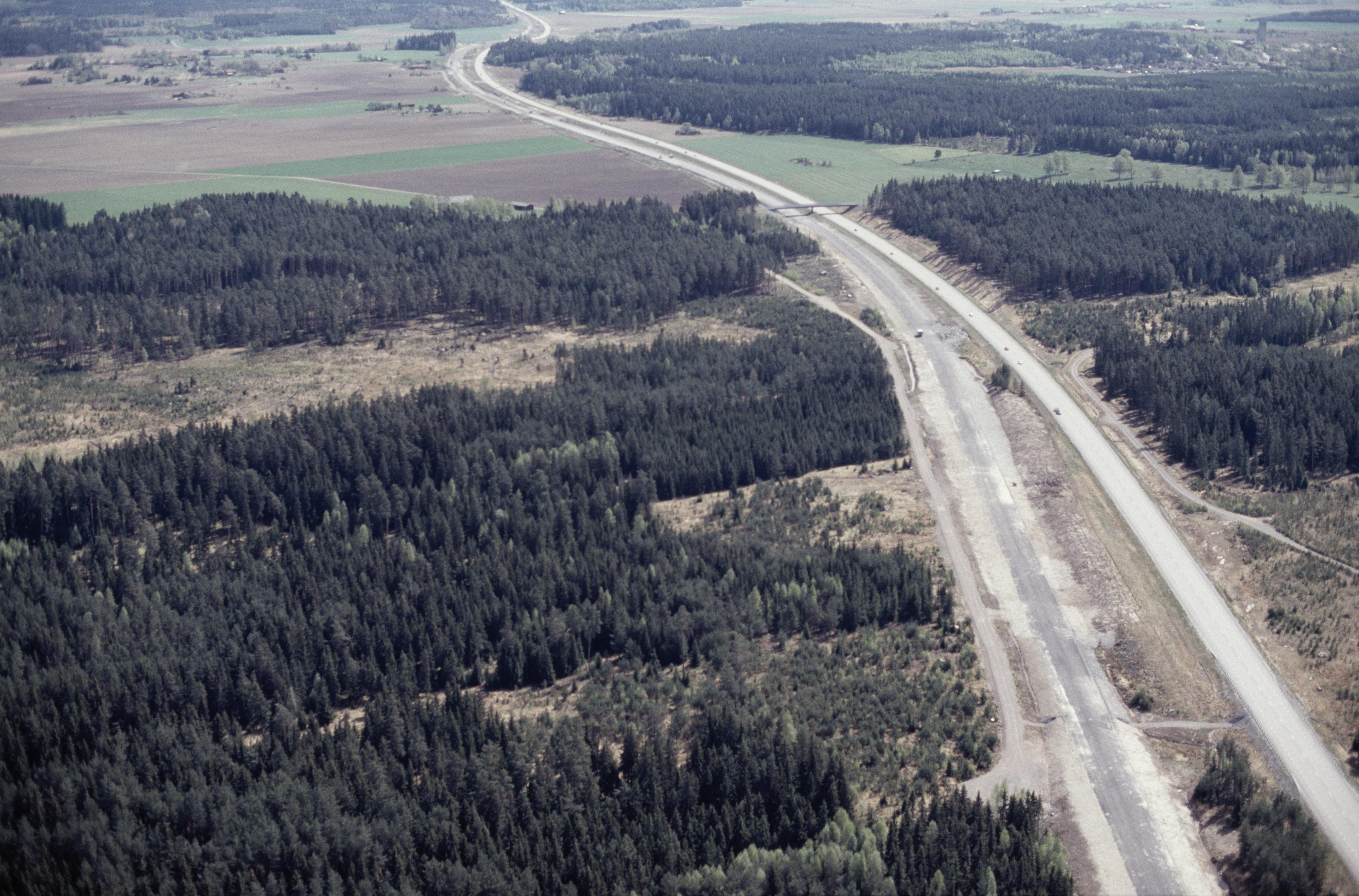 Beskrivning: Arkeologiska undersökningar i samband med bygge av väg E18 genom fornlämningsområden söder om Tibble. I bildens övre del Fiskvik, Knoppbacka och Skäggesta med bl.a. grav- och boplats RAÄnr Litslena 561:1-3. Bilden är tagen mot (väderstreck): OSO