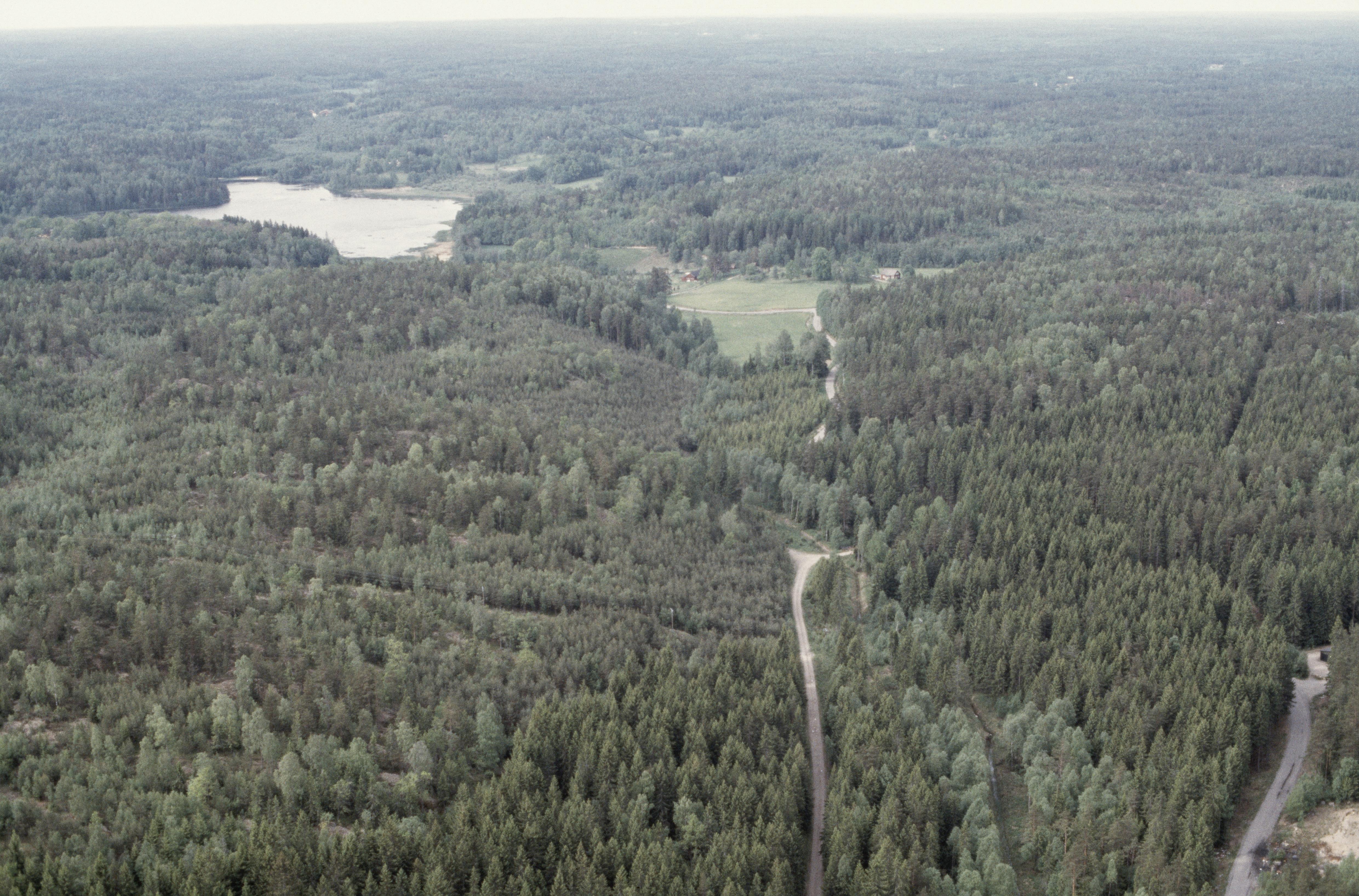 Beskrivning: Dalgången från Tornberget mot Sadelmakartorp, Smedjan och Vedans gård vid Vedasjön. Under bildens mitt boplats RAÄnr Västerhaninge 483:1-2. Bilden är tagen mot (väderstreck): SV