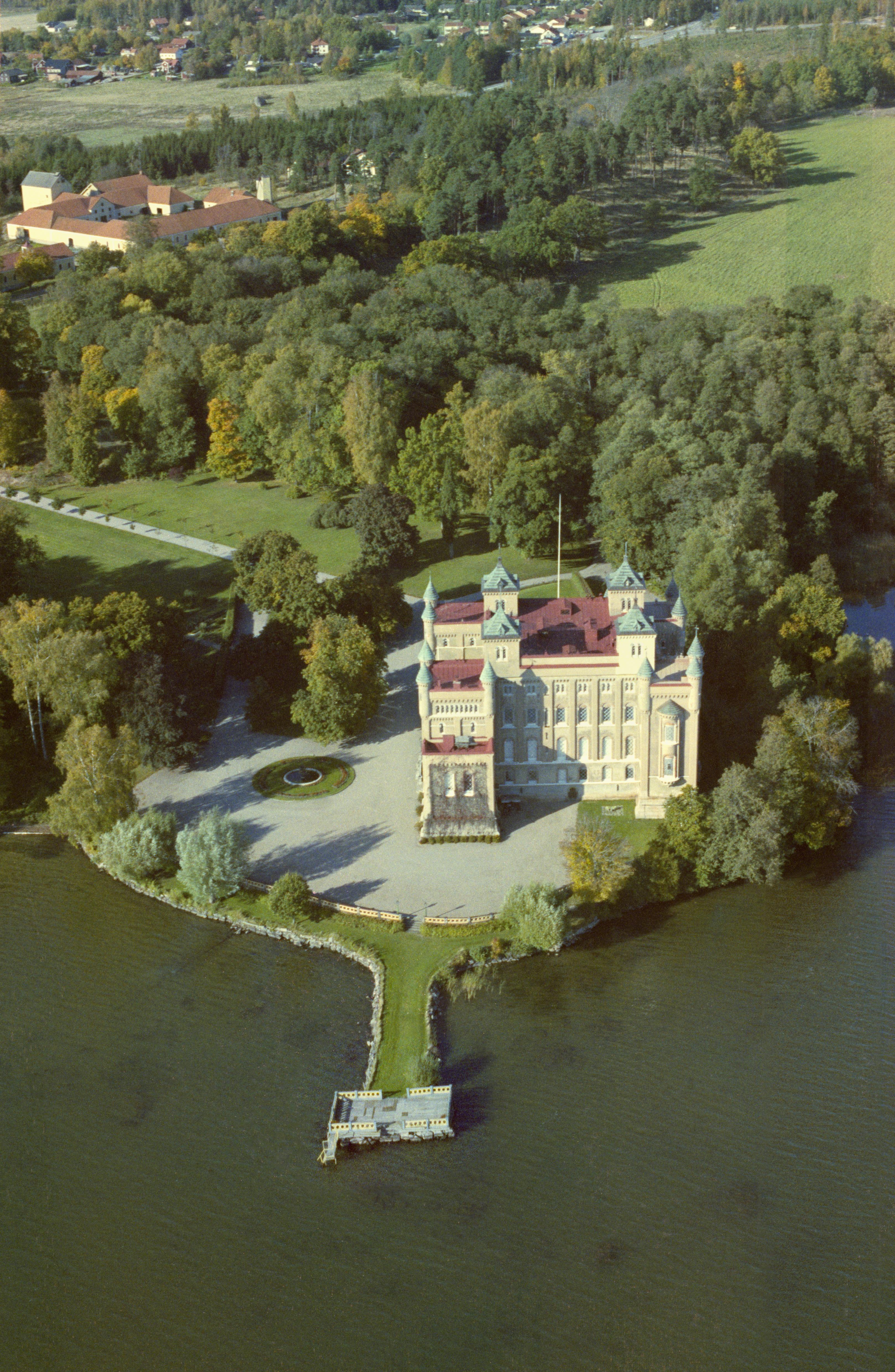 Beskrivning: Stora Sundby slott, byggnadsminne RAÄnr Öja 58:1, vid Slottsviken i nordöstra delen av sjön Hjälmaren. I bildens övre del Alberga tätort. Bilden är tagen mot (väderstreck): NNV