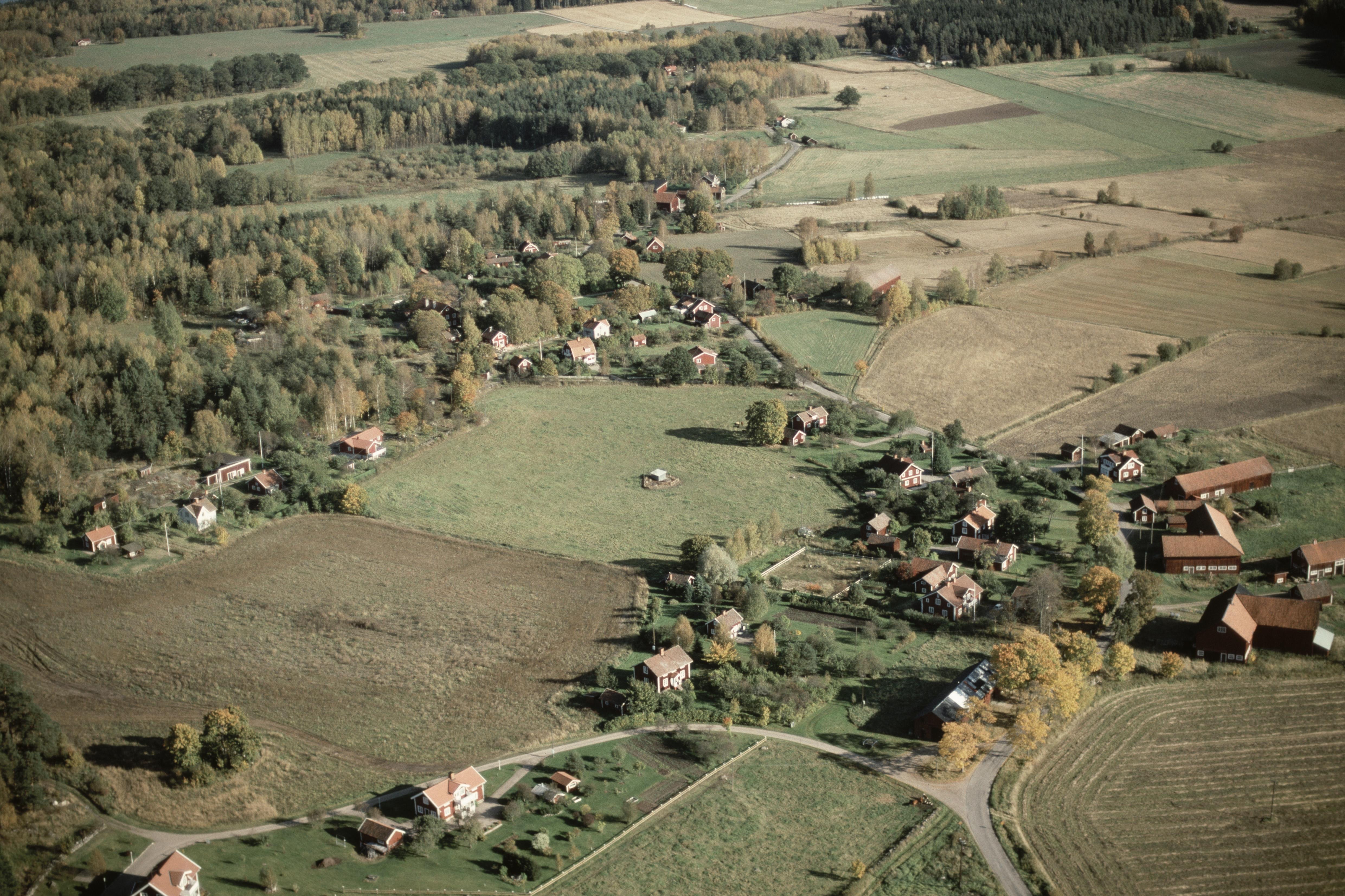 Beskrivning: Ättersta by. Vid bildens mitt vägmärke RAÄnr Österåker 16:1. I bildens övre del sjön Öljaren. Bilden är tagen mot (väderstreck): Ö