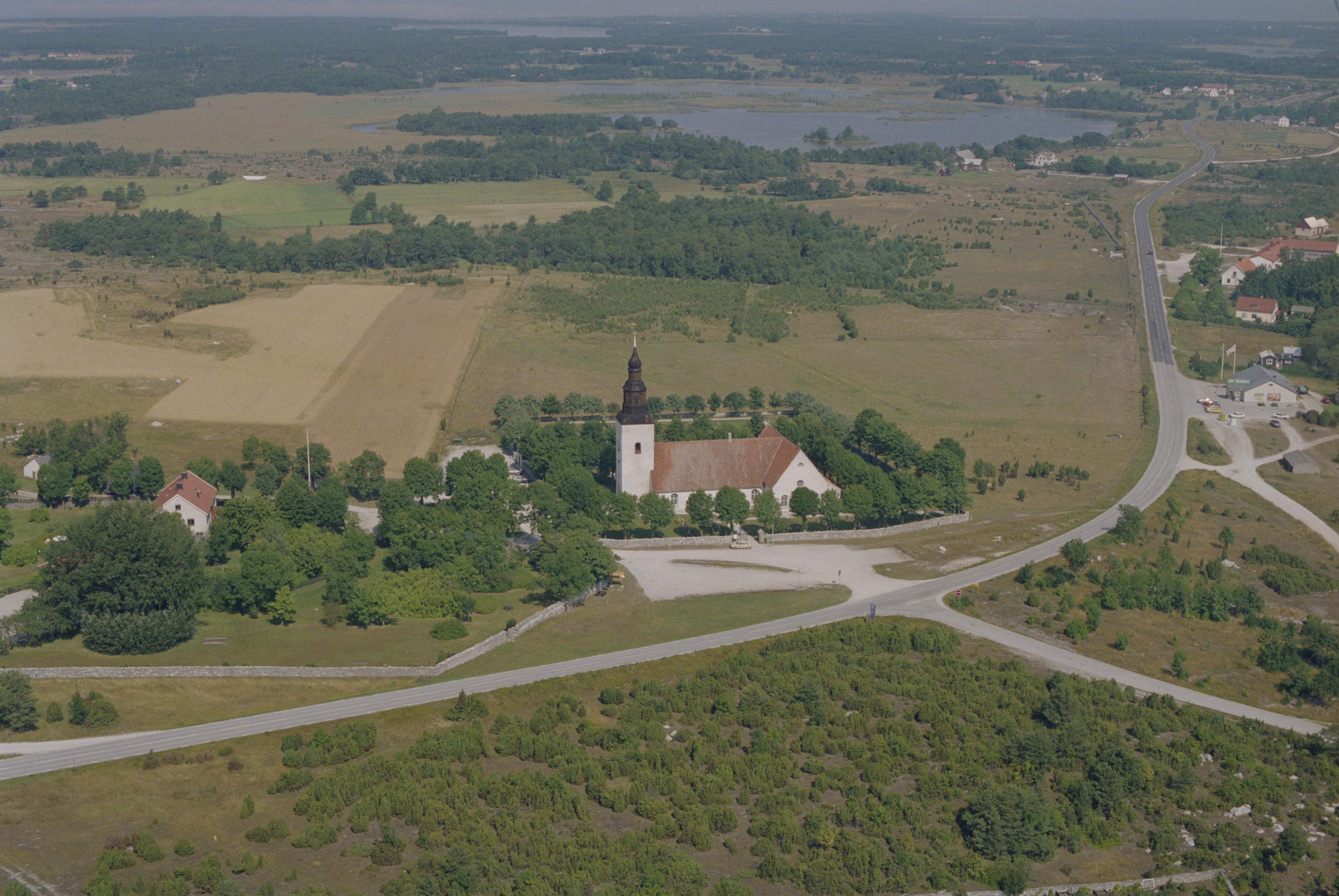 Beskrivning: Fårö kyrkby. Fårö kyrka vid bildens mitt. I bildens nedre del stensättning RAÄnr Fårö 353:1. I bildens övre del sjön Mölnorträsk. Bilden är tagen mot (väderstreck): N