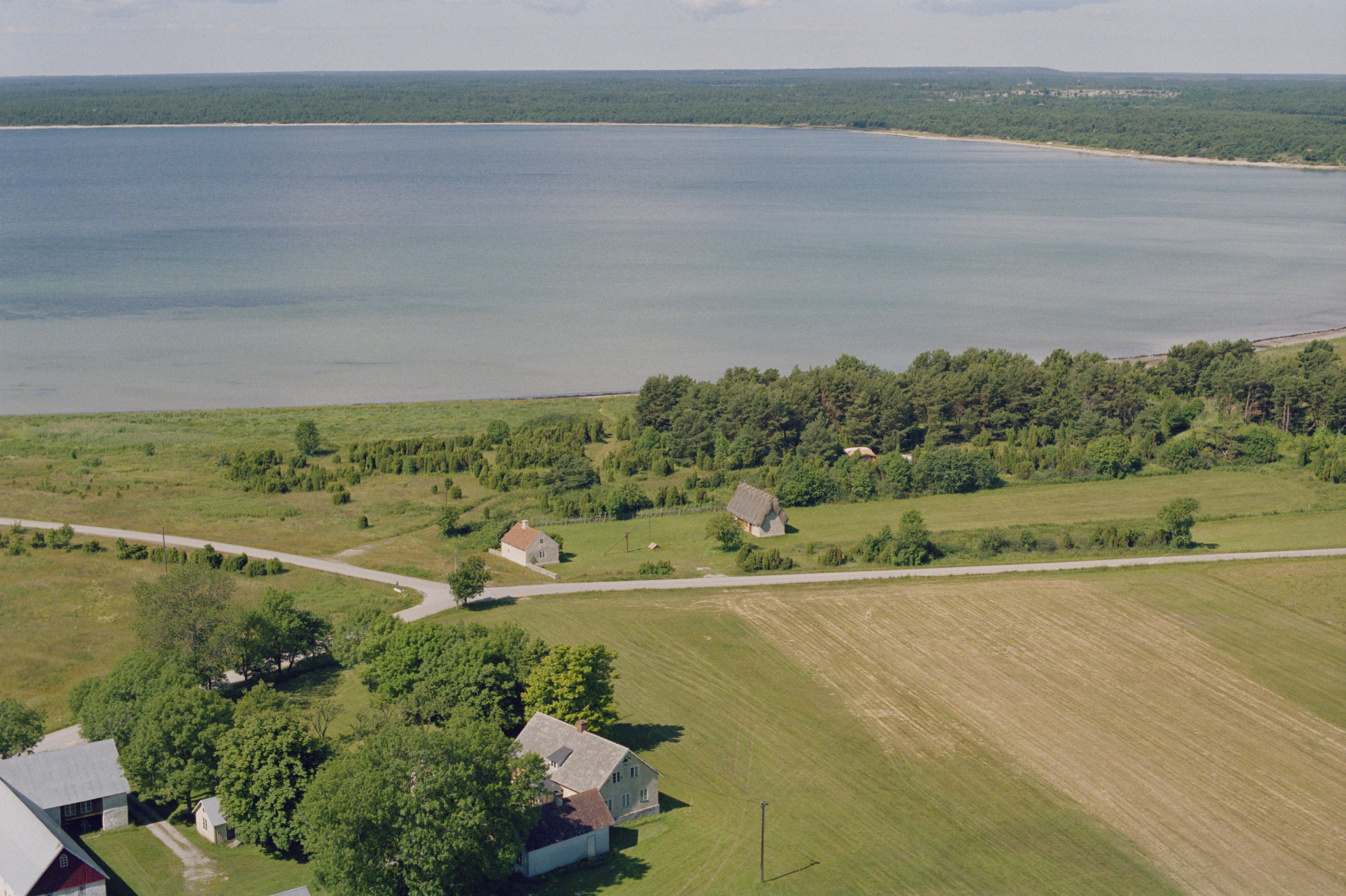 Beskrivning: Nordvästra området på Sysneudd. Gårdar vid Sandviken i västra delen av Sysne by. I bildens övre del socknet Östergarn. Bilden är tagen mot (väderstreck): V