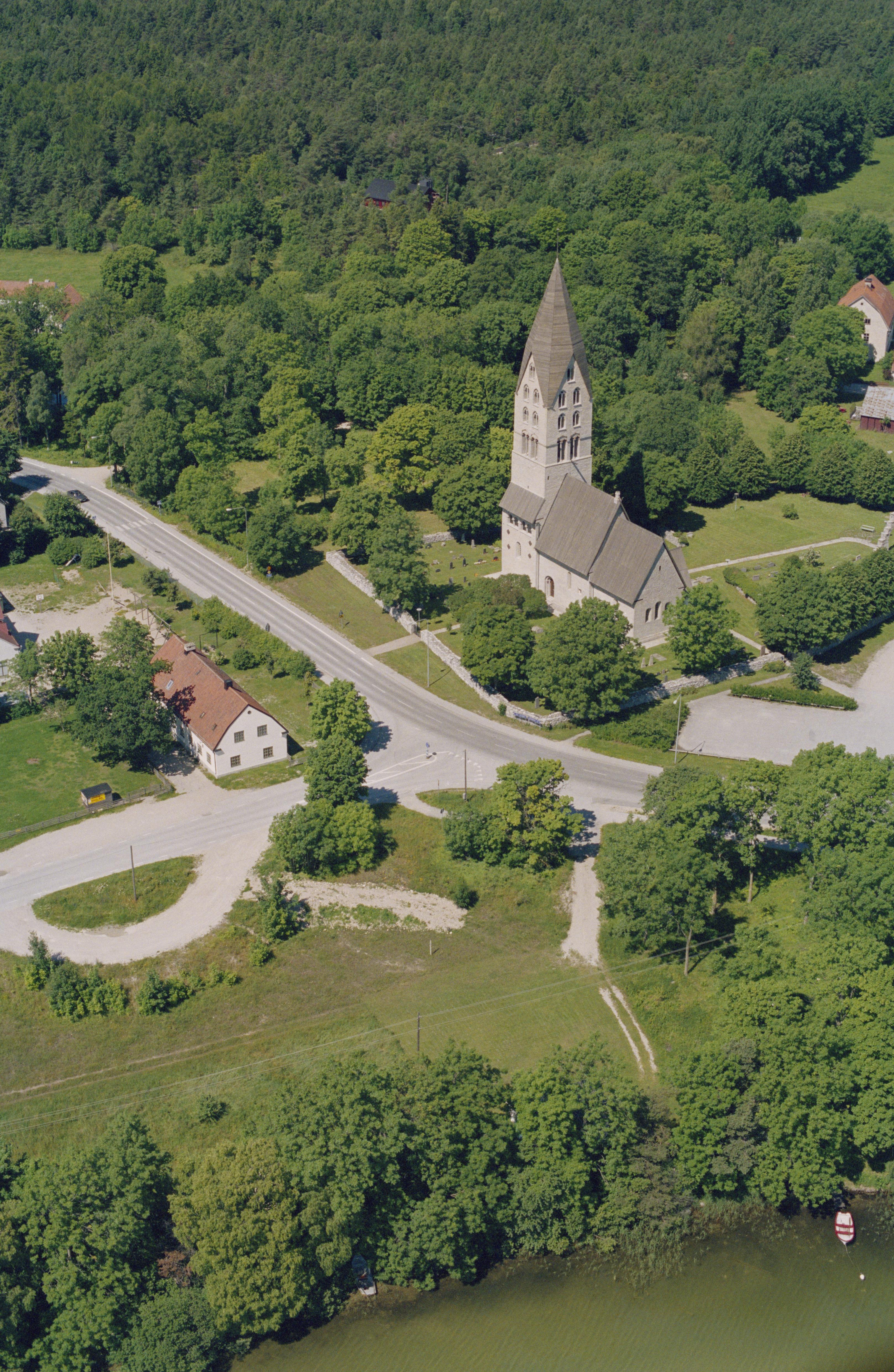 Beskrivning: Tingstäde kyrkby. Tingstäde kyrka vid bildens mitt. Vid kyrkan husgrund RAÄnr Tingstäde 1:1. Sjön Tingstäde träsk i bildens nedre kant. Bilden är tagen mot (väderstreck): NV