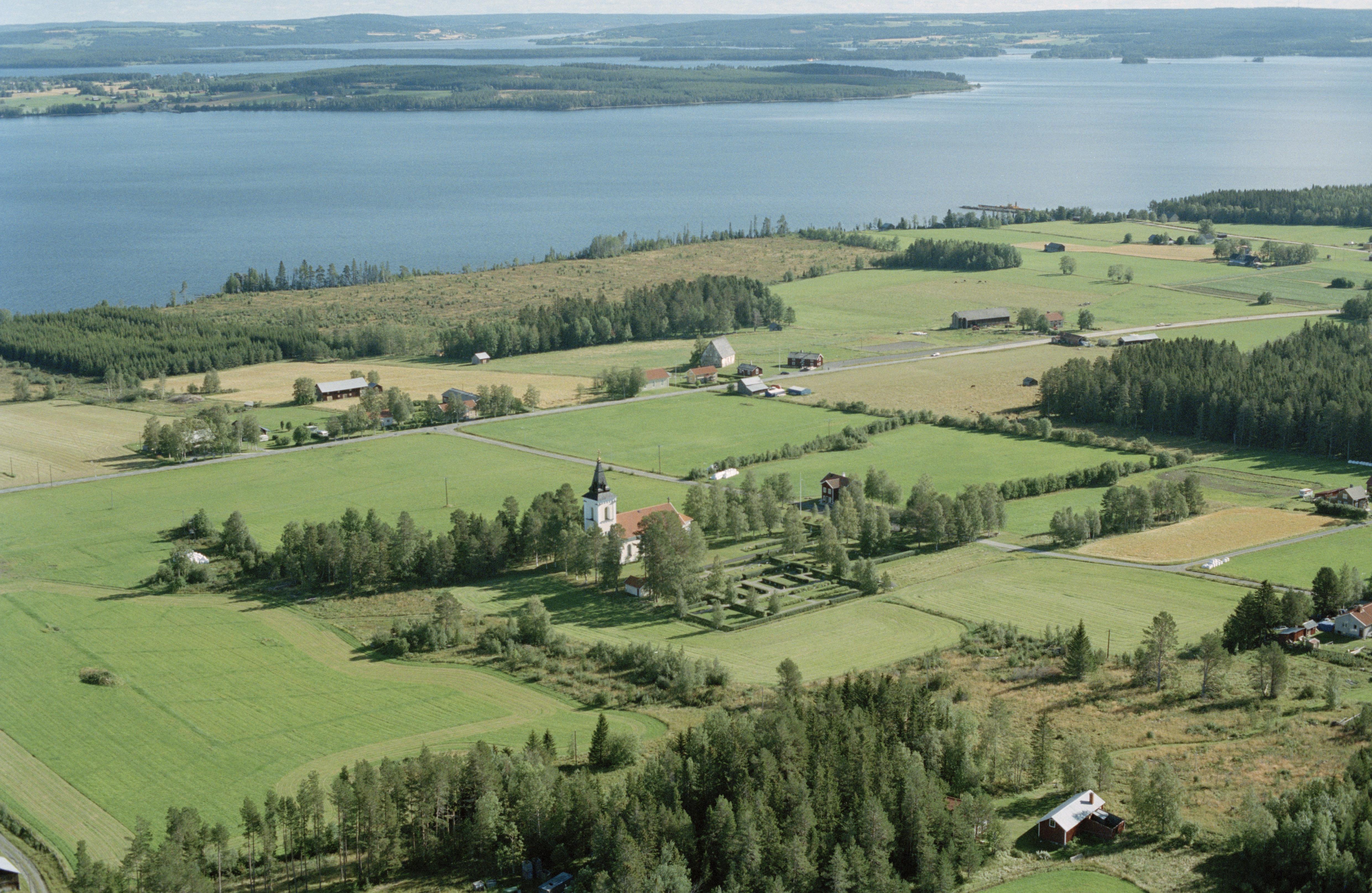 Beskrivning: Marby kyrkby vid Storsjön. Marby nya kyrka till vänster om bildens mitt. Marby gamla kyrka RAÄnr Marby 25:1 i bildens mitt. Bilden är tagen mot (väderstreck): ONO