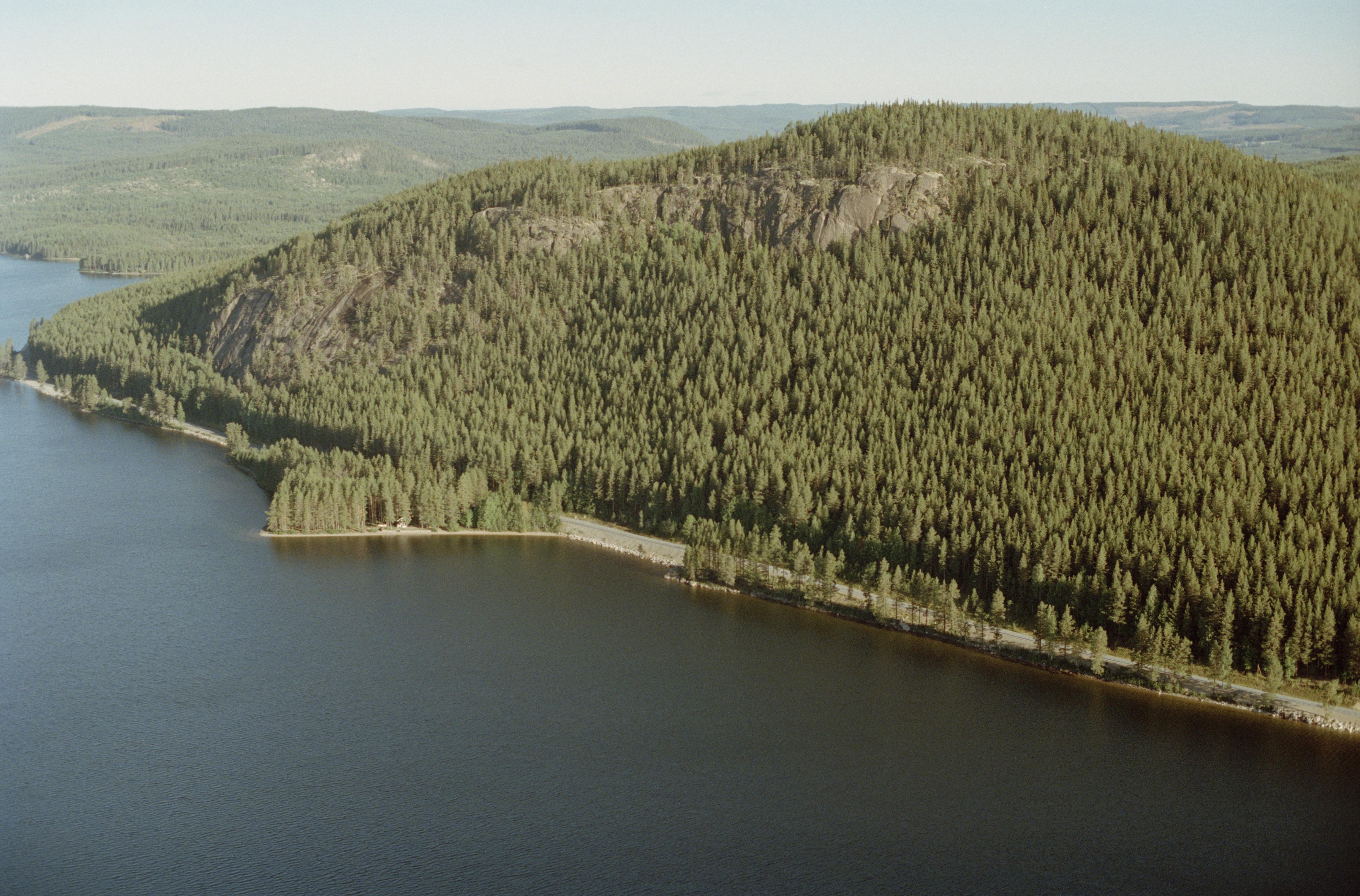 Beskrivning: Berget Västerkleven vid Idsjön. På udden Klevsand till vänster över bildens mitt boplats RAÄnr Nyhem 54:1 och gravfält Nyhem 10:1. Bilden är tagen mot (väderstreck): NV