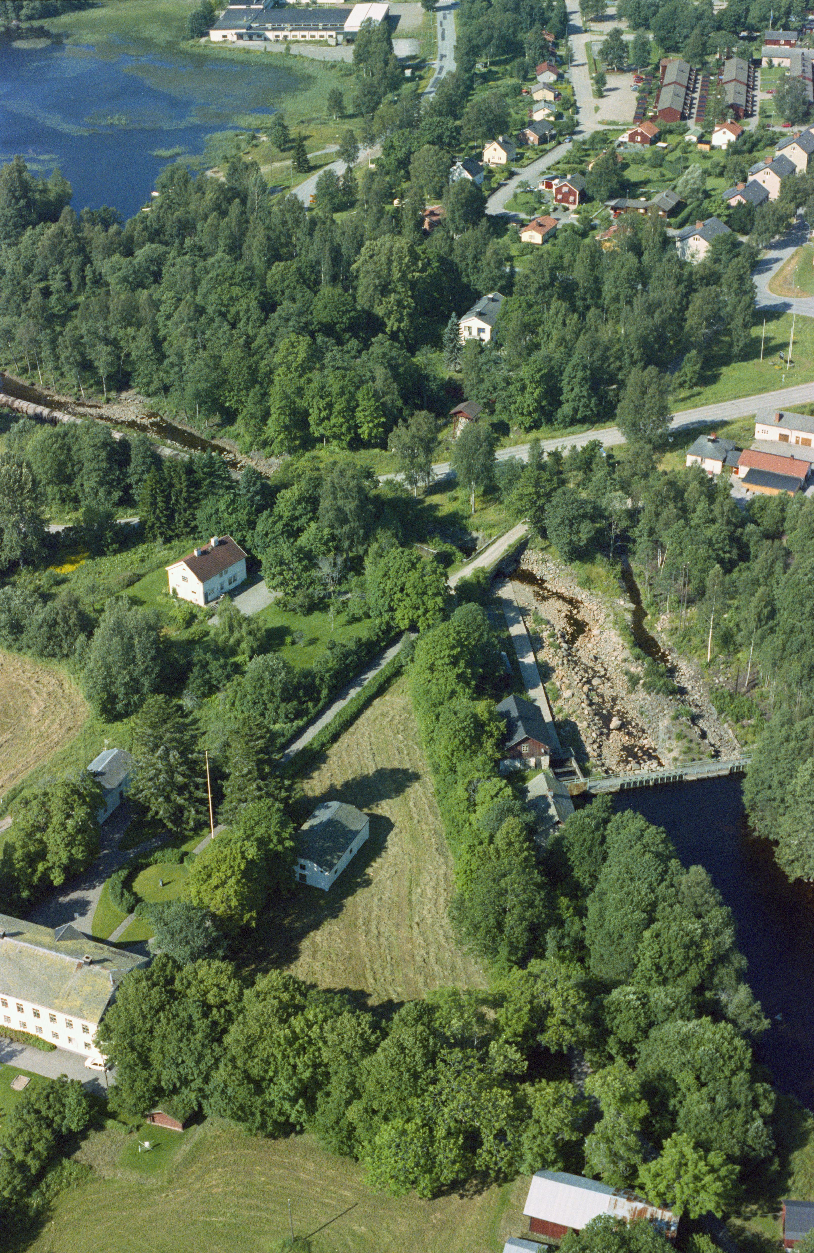 Beskrivning: Tätorten Grythyttan mellan sjöarna Torvarpen (i bildens övre del) och Sör-Älgen. Vid bildens mitt Grythyttans gamla tomt och brukslämning RAÄnr Grythyttan 45:1-2 vid bron Grythyttan 110:1. Grythytte herrgård nere i vänstra hörnet. Bilden är tagen mot (väderstreck): VNV