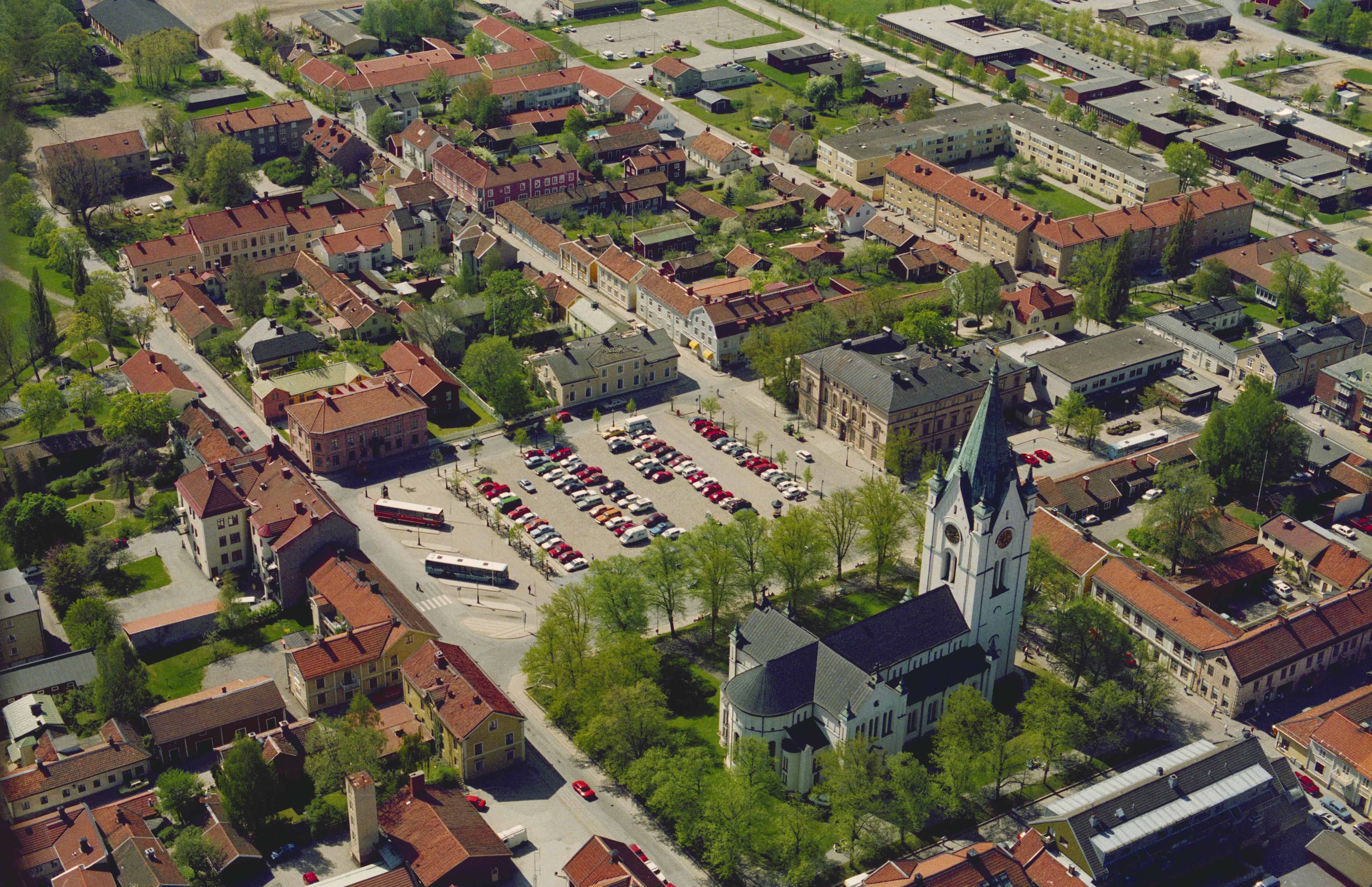 Beskrivning: Nora stad. Nora kyrka vid Torget i stadslager RAÄnr Nora 164:1. Bilden är tagen mot (väderstreck): SV