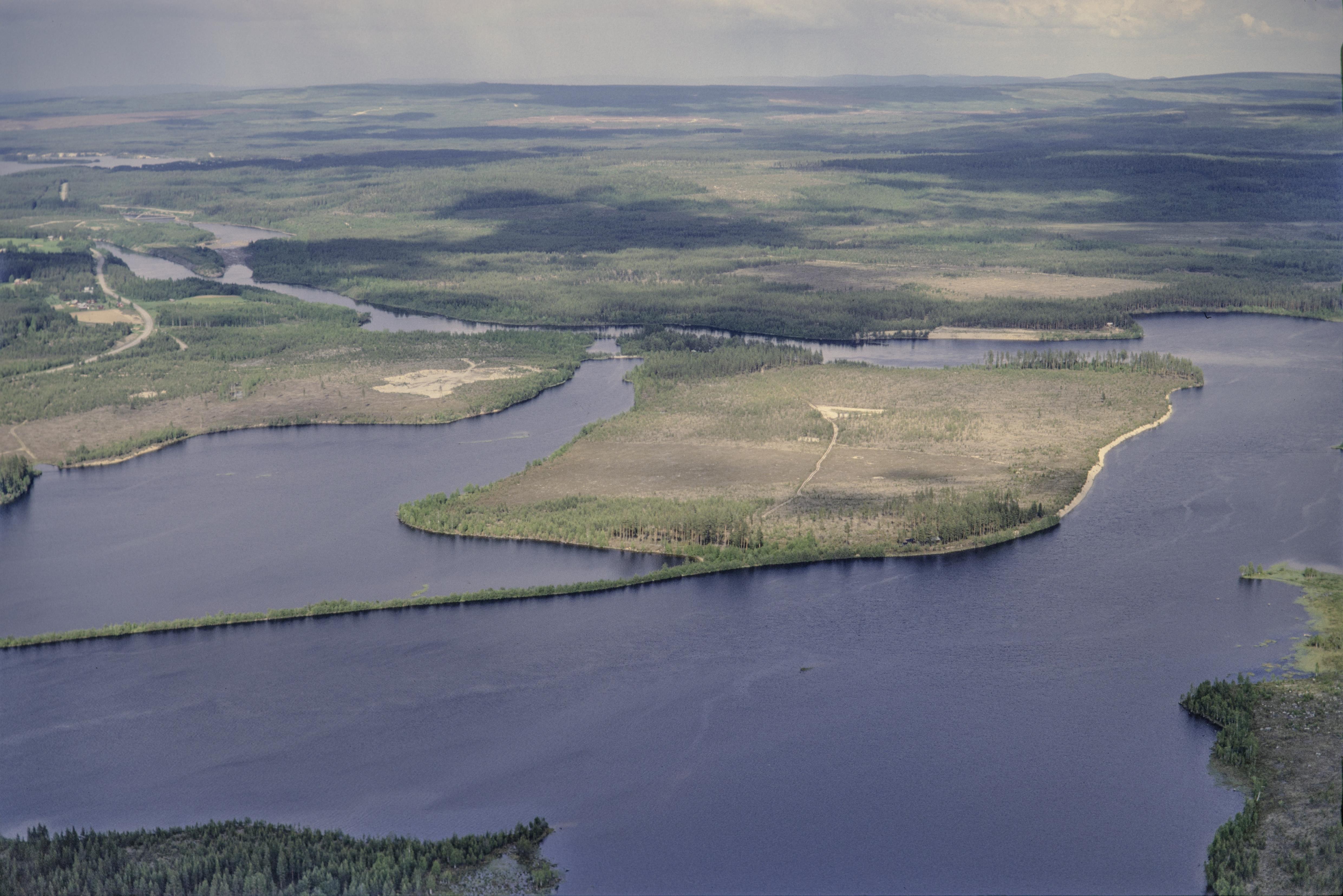 Beskrivning: Ångermanälven sydväst om byn Västanbäck. Över bildens mitt Kortingön och flera fångstgropar. På och vid ön boplats RAÄnr Junsele 122:1 vid fångstgrop Junsele 52:1, 53:1 m.fl. Längs bildens mitt fångstgrop RAÄnr Junsele 104:1. Bilden är tagen mot (väderstreck): NO