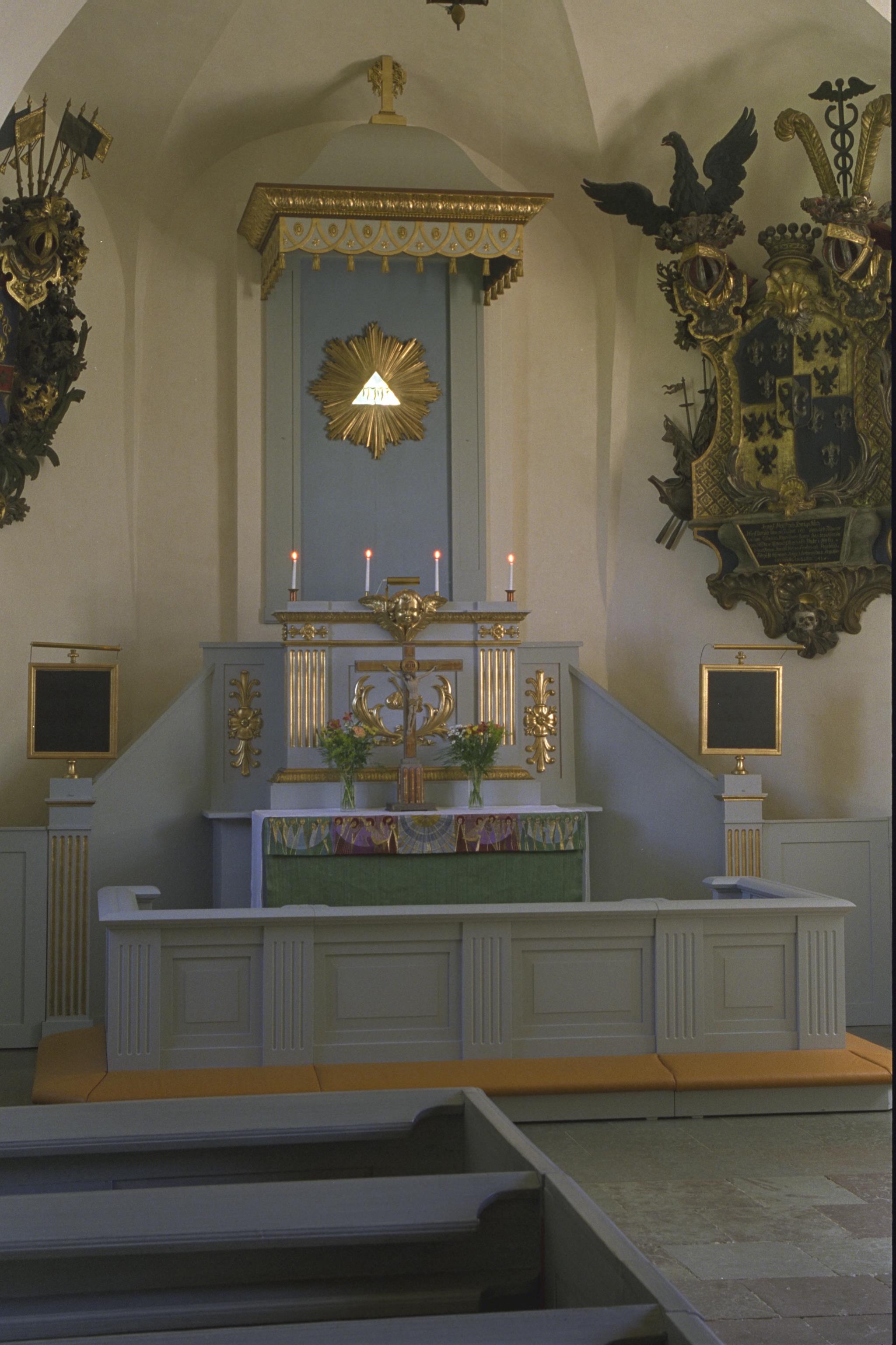 Beskrivning: Altaret med bakomliggande predikstol.