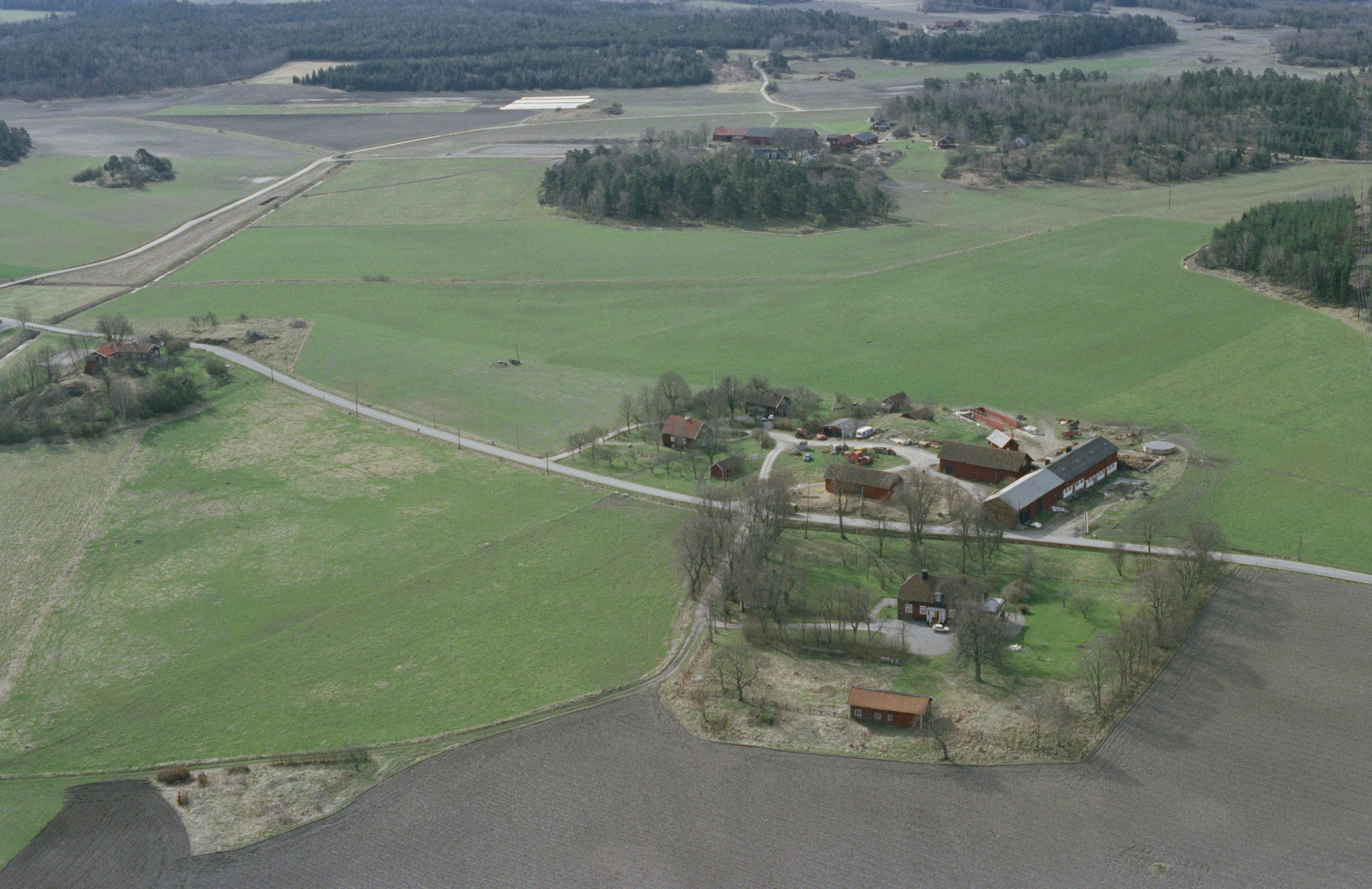 Beskrivning: Till vänster gravfält RAÄnr Lovö 26:1. Till höger Lovö prästgård. I bildens övre del Berga gård. Bilden är tagen mot (väderstreck): SO