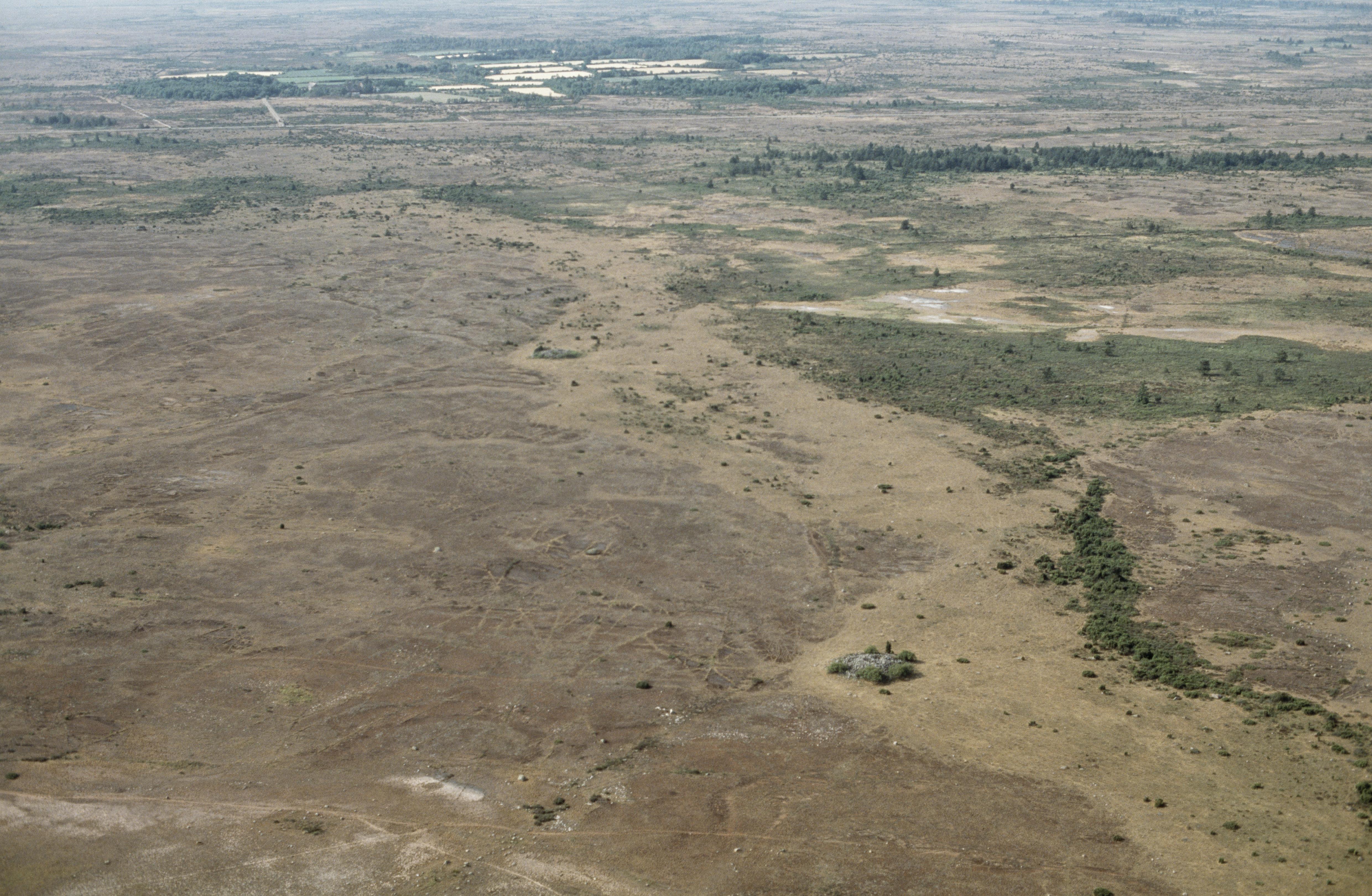 Beskrivning: Alvaret. Röse Rörbacken RAÄnr Stenåsa 46:1 och 45:1 (vid bildens mitt) vid gränsen mellan socknen Stenåsa och Hulterstad. Gösslunda by i bildens övre del. Bilden är tagen mot (väderstreck): S