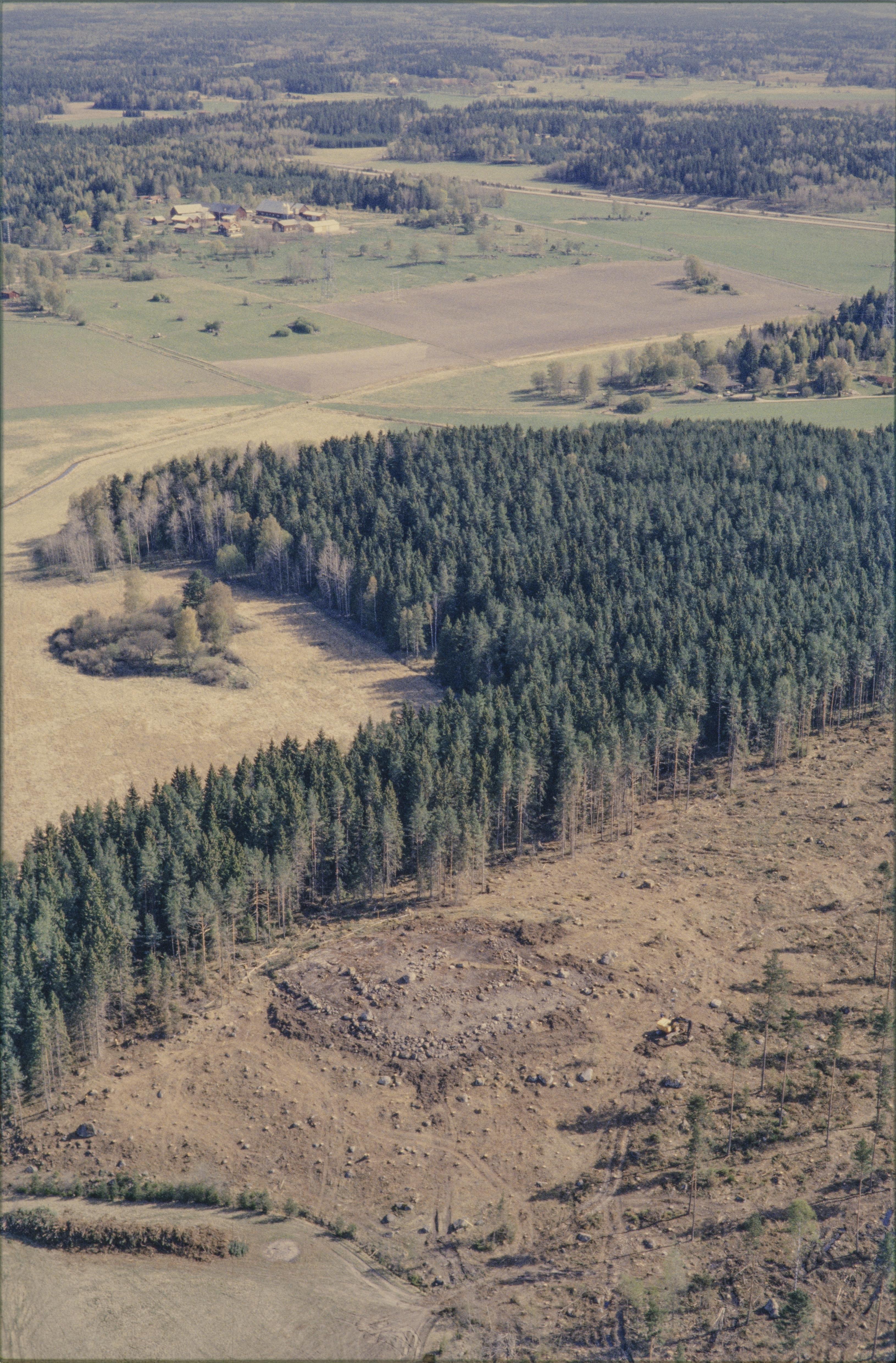 Beskrivning: Arkeologisk undersökning innan bygge av järnväg (Arlandabanan) i Rickebyåns dalgång i områden söder om Svartsjön. Under bildens mitt fornborg Odensala 235:1, boplats Odensala 489:1, m.fl. Bilden är tagen mot (väderstreck): NO