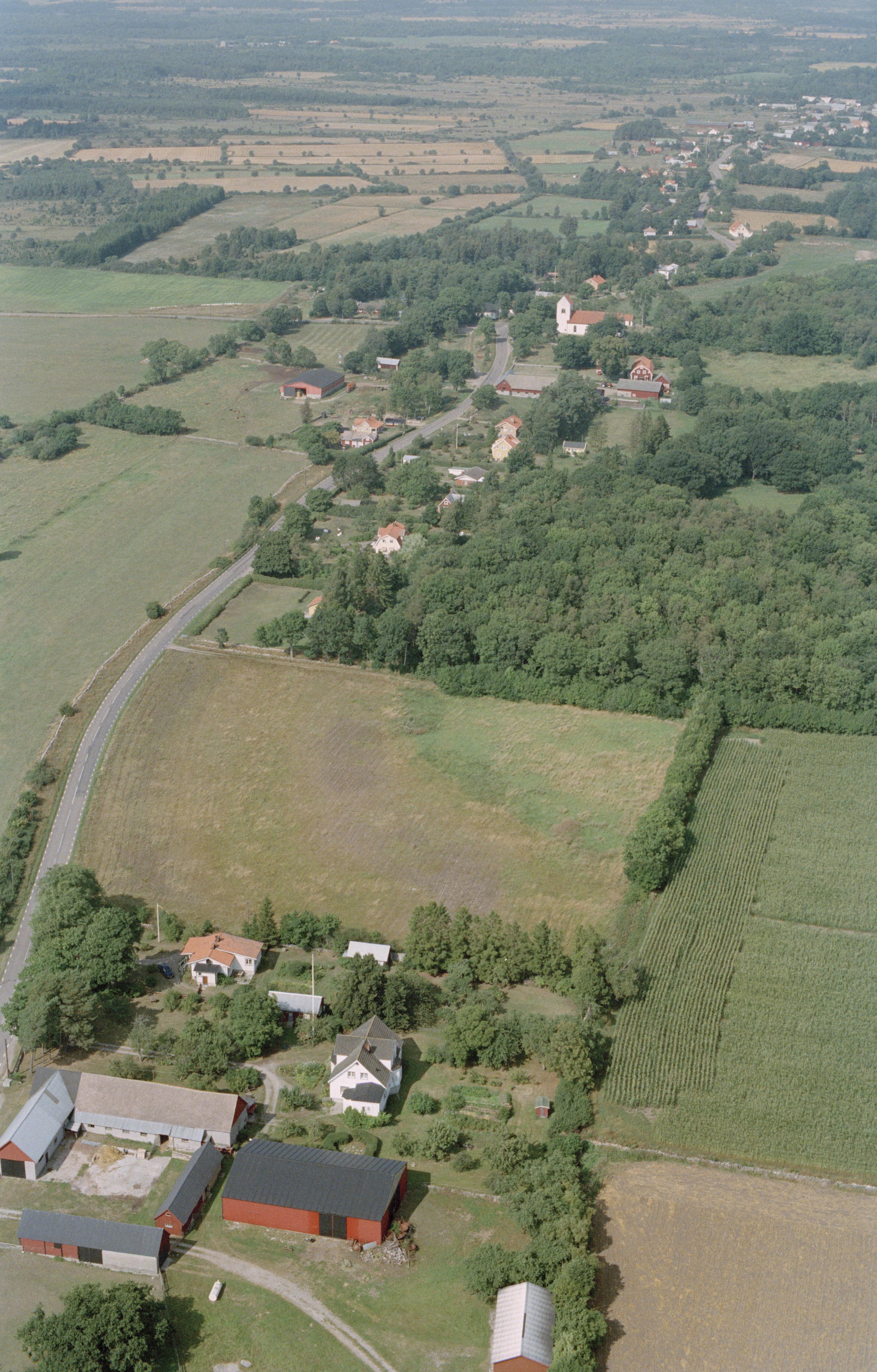 Beskrivning: Långlöts kyrka och kyrkby i bildens övre del. Bilden är tagen mot (väderstreck): N