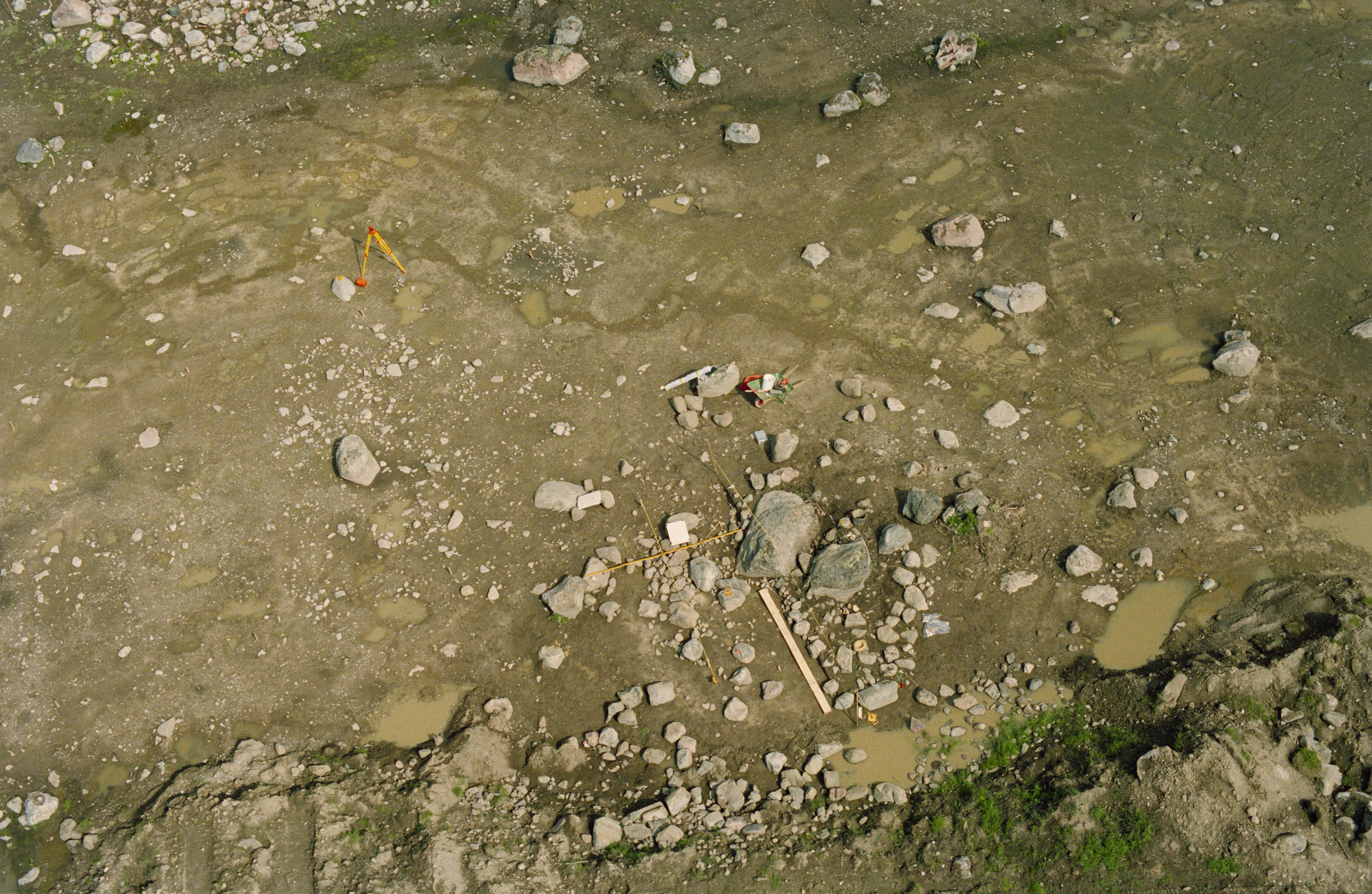 Beskrivning: Arkeologisk undersökning innan bygge av järnväg (Arlandabanan) i Rickebyåns dalgång vid Åslunda by sydost om Svartsjön. Bo- och gravplats RAÄnr Odensala 11:1, 13:1 och 402:1-2 m.fl. Bilden är tagen mot (väderstreck): N