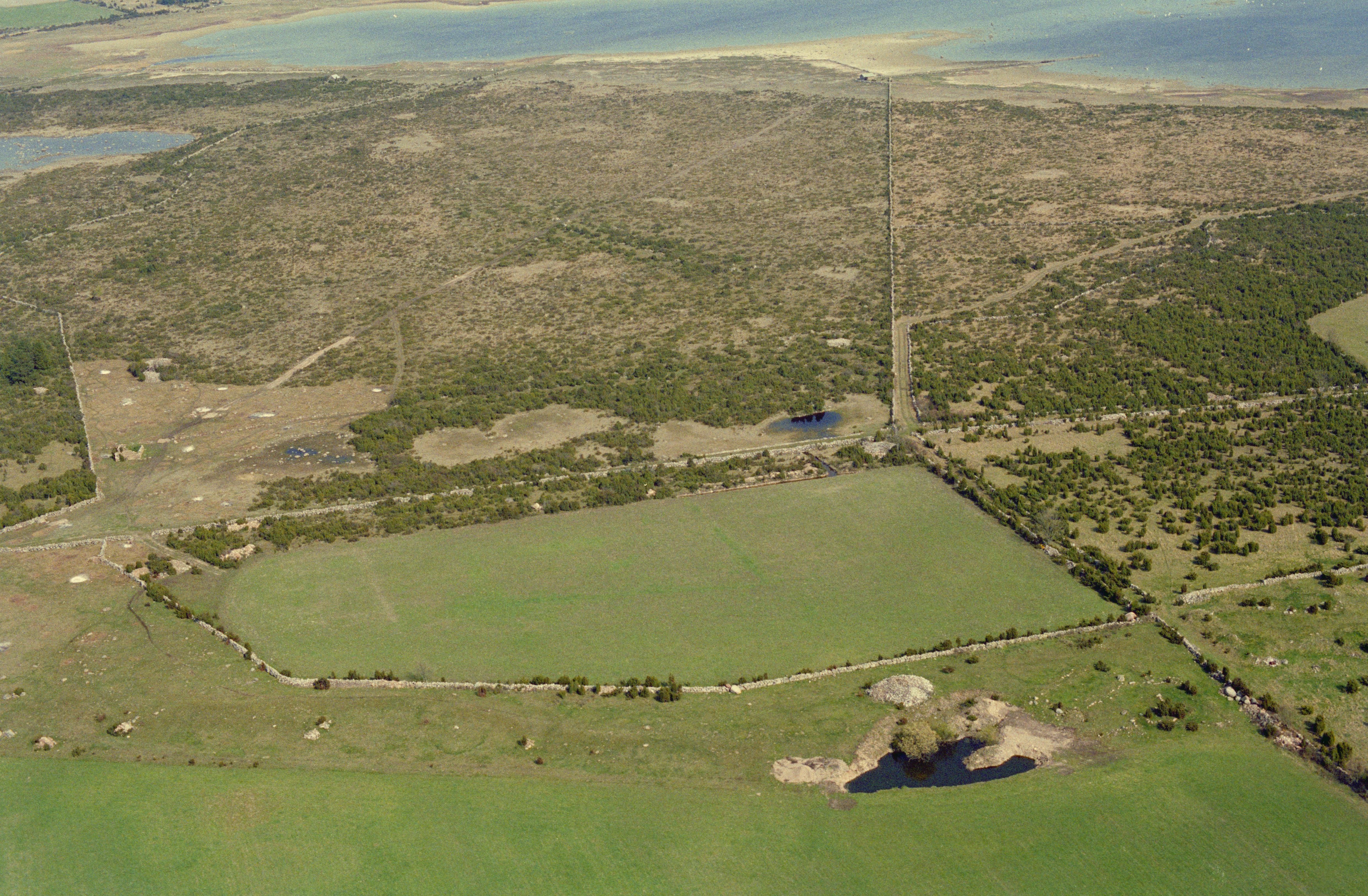 Beskrivning: Trullbjärg norrost om Djurstad. Boplats RAÄnr Föra 4:1 (vid bildens mitt), hägnader Föra 10:3 m.fl. Bilden är tagen mot (väderstreck): Ö