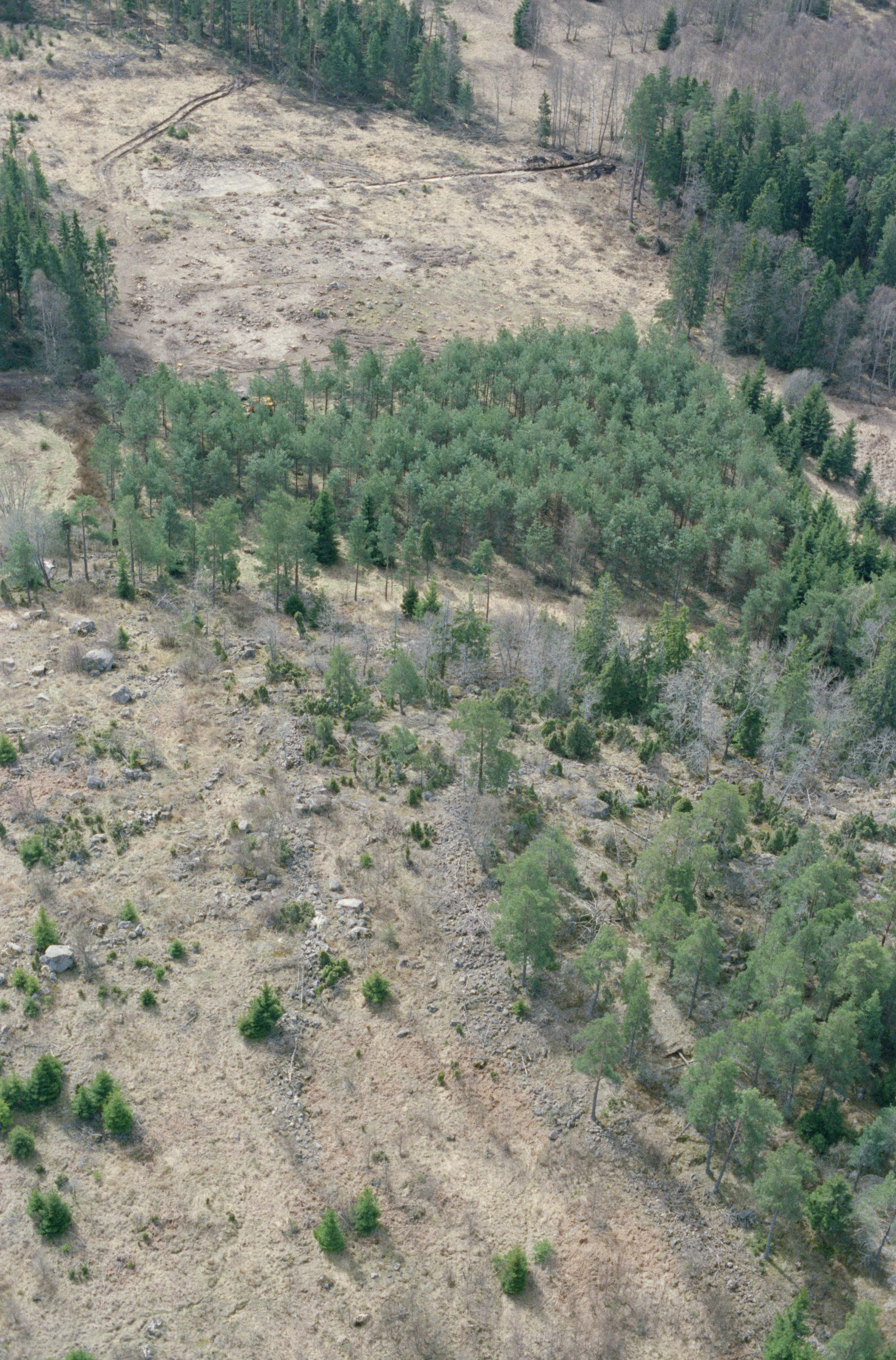 Beskrivning: Rössberga innan bygge av järnväg (Arlandabanan) i Rickebyåns dalgång. Över bildens mitt husgrund RAÄnr Odensala 356:1. Vid bildens mitt boplats Odensala 403:1. I bildens nedre del Rössberga fornborg Odensala 159:1. Bilden är tagen mot (väderstreck): S
