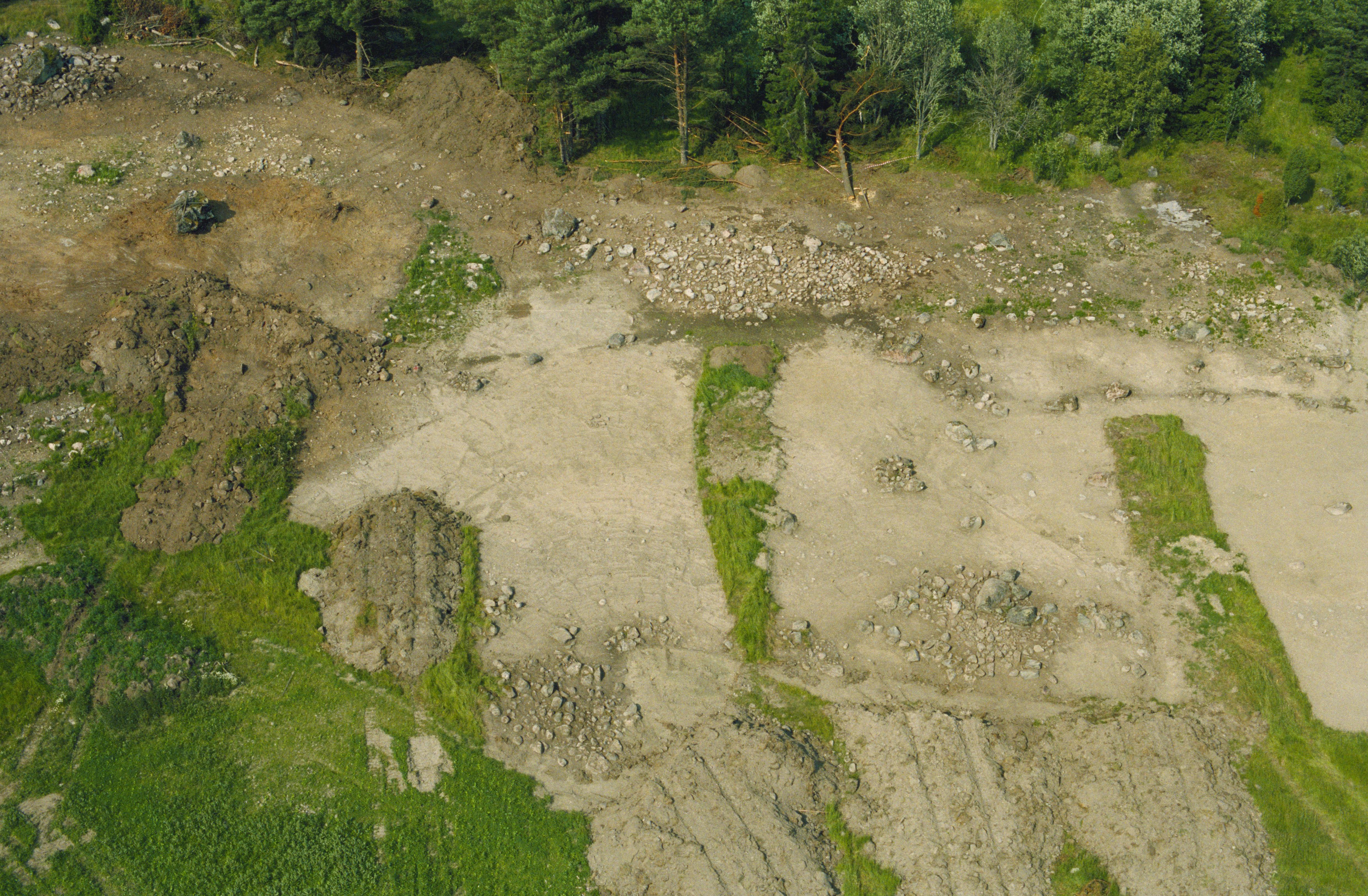 Beskrivning: Arkeologisk undersökning öster om Rickebyåns dalgång innan bygge av järnväg (Arlandabanan). Stensättning RAÄnr Odensala 236:1. i skogsområde öster om Sjötorpet, söder om Svartsjön, väster om Åslunda by. Bilden är tagen mot (väderstreck): N