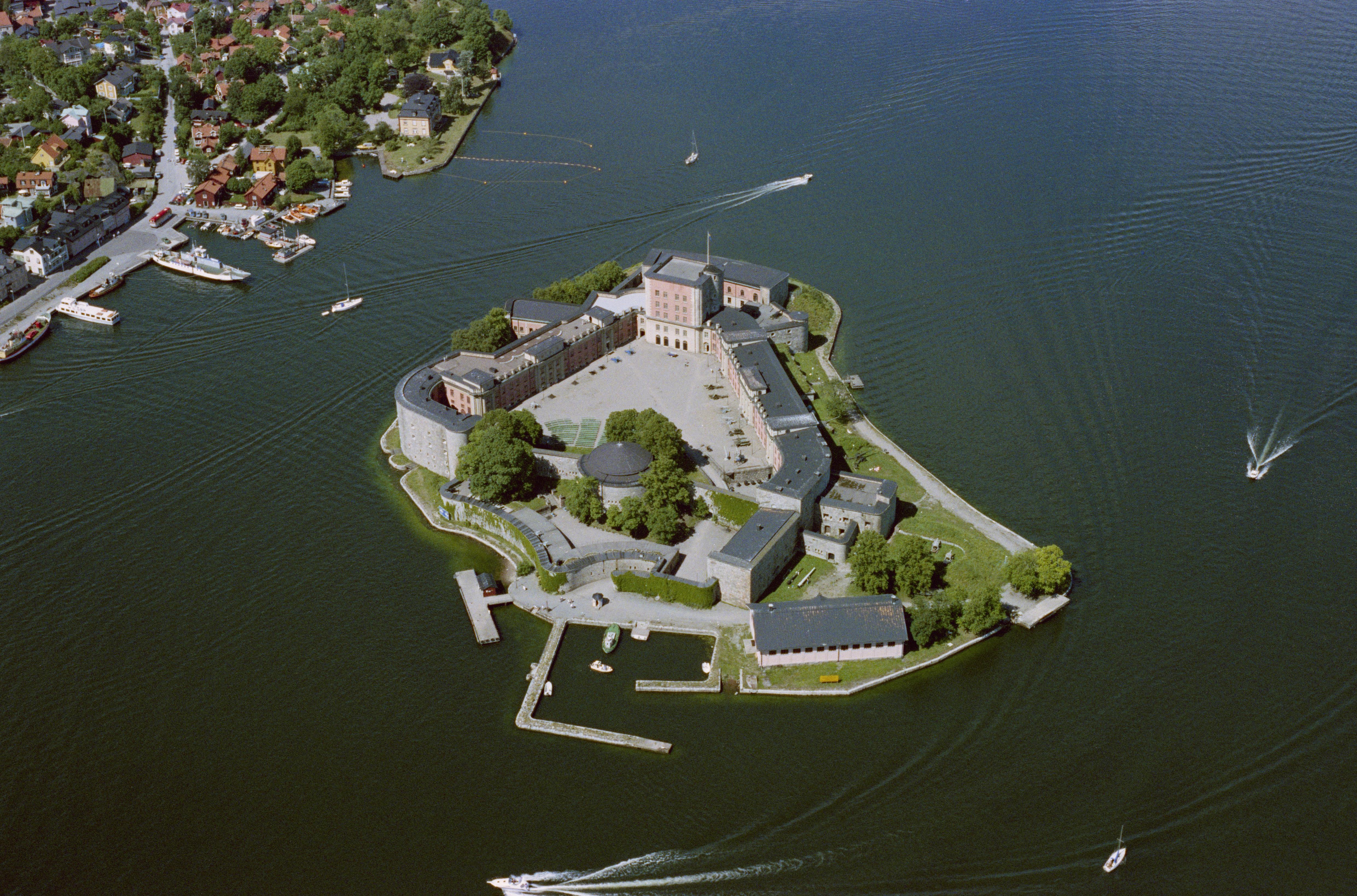 Beskrivning: Ön Vaxholmen i Vaxholmsfjärden. På ön Vaxholms fästning / Vaxholms kastell - statligt byggnadsminne RAÄnr Vaxholm 11:1. Uppe till vänster tätorten Vaxholm. Bilden är tagen mot (väderstreck): NV
