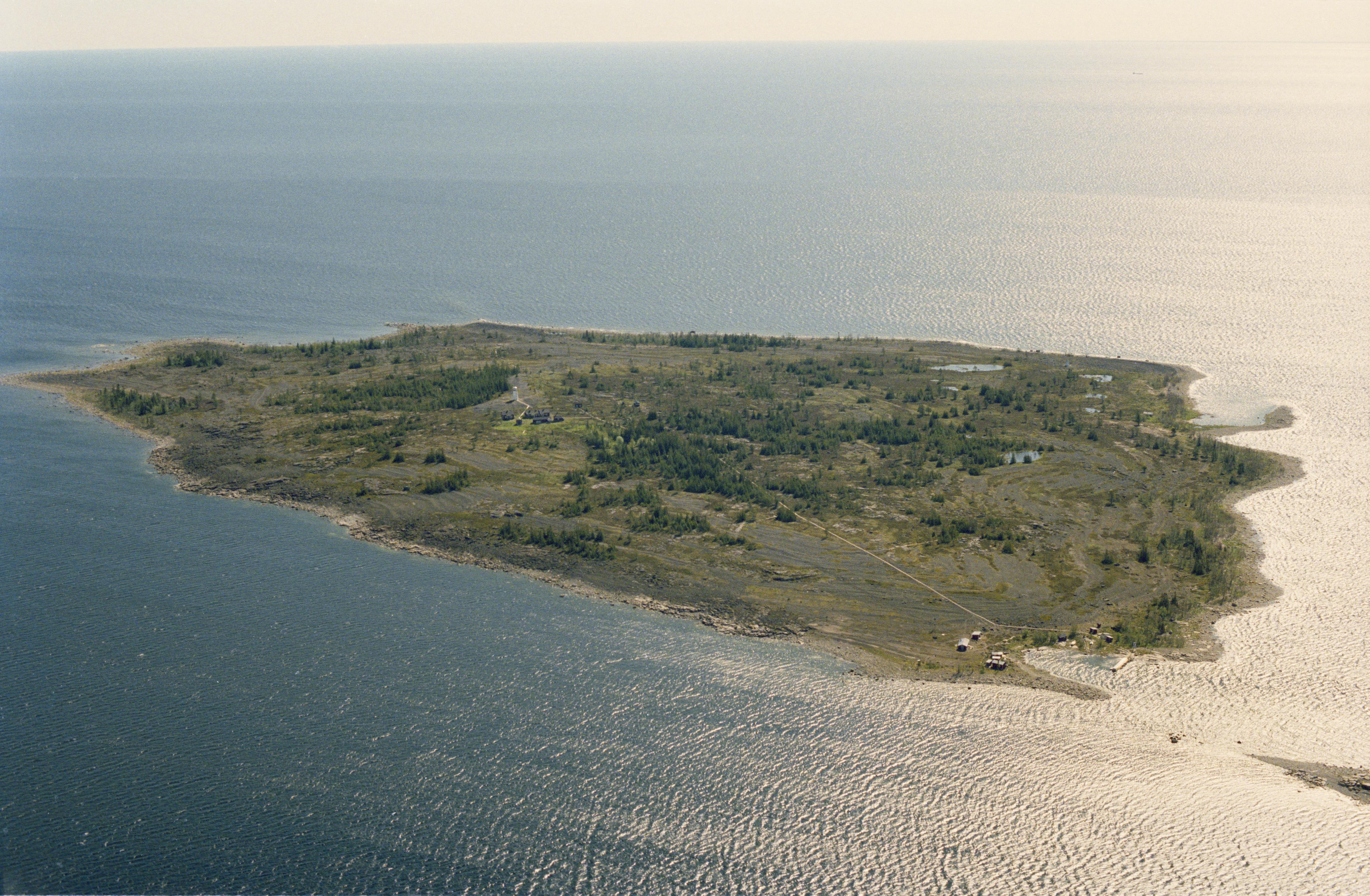 Beskrivning: Ön Stor-Fjäderägg (skrivs även Stora Fjäderägg). Vid bildens mitt fyrplats RAÄnr Holmön 28:1. På ön även flera labyrinter. Stor-Fjäderägg ingår i ögruppen Holmöarna i sundet Norra Kvarken. Bilden är tagen mot (väderstreck): OSO