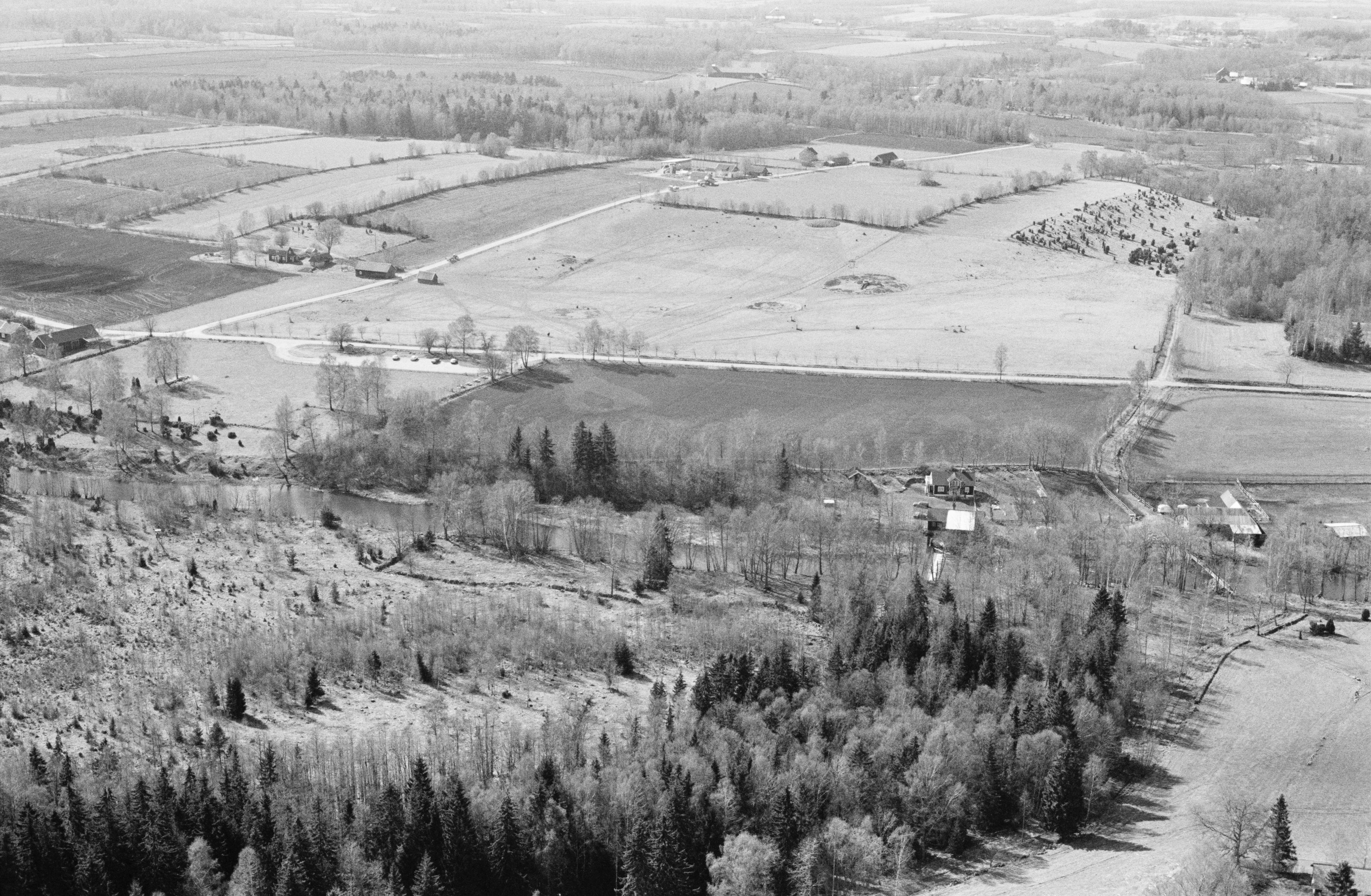 Beskrivning: Ån Slafsan. Gravfält, hällristningar, röse m.m. RAÄnr Hornborga 22:1, 27:1-4, 29:1-3, 31:1-5 (stenkammargrav Gigerugnen / Girommen med hällristningar och stenkrets), 32:1-2 m.fl. Bilden är tagen mot (väderstreck): VSV