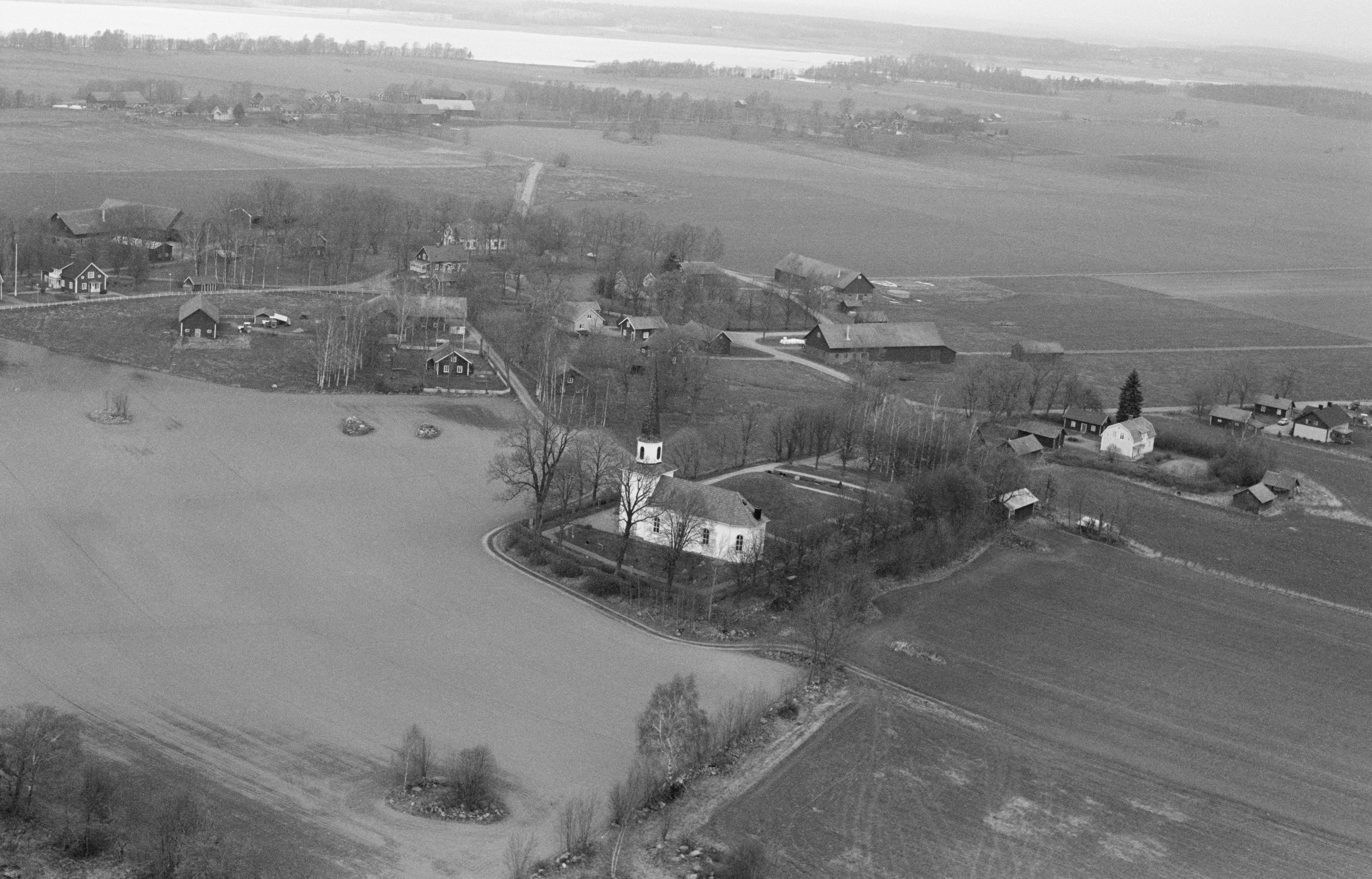Beskrivning: Flistads kyrka framför storhögen "kung Ranes hög" RAÄnr Flistad 12:1. Bilden är tagen mot (väderstreck): NNO