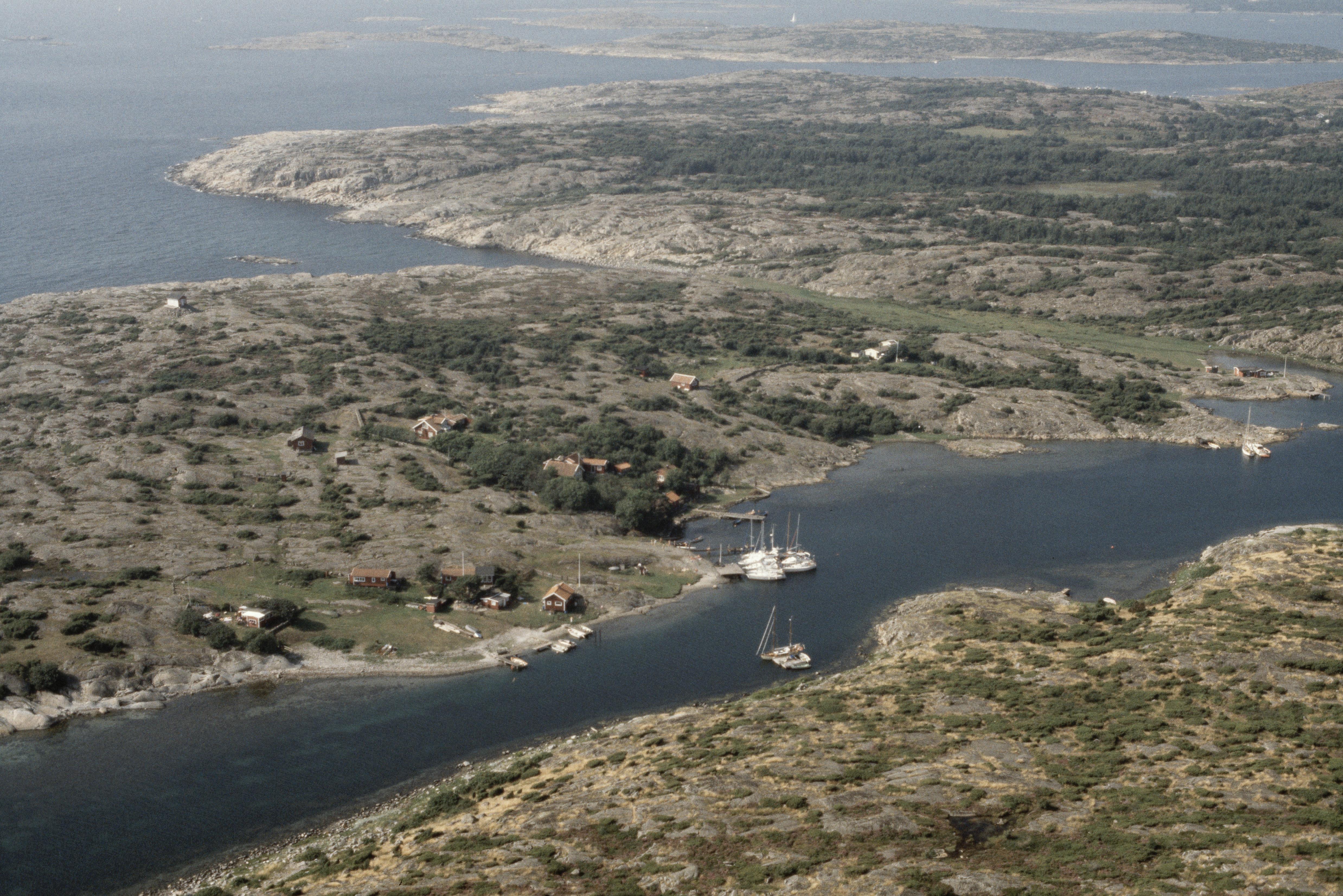 Beskrivning: Mönster halvö till vänster och ön Hästholmen nere till höger. Lotsplats från 1700-talet. Labyrint RAÄnr Onsala 46:1, kyrkogård Onsala 45:1, röse Onsala 56:1 m.fl. Bilden är tagen mot (väderstreck): NV