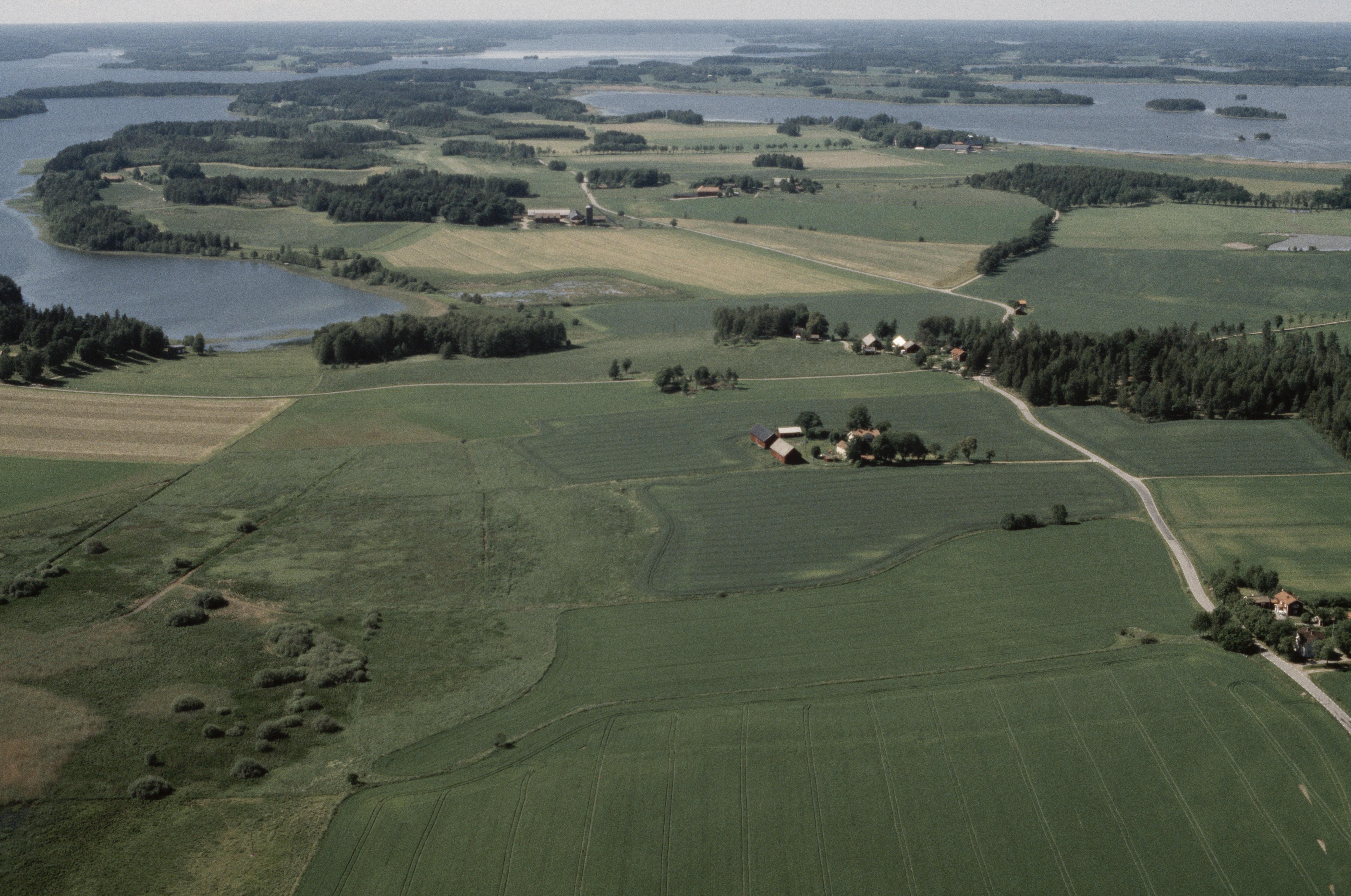 Beskrivning: Till vänster Fyrsjö gård vid sjön Yngarn. Vid bildens mitt Goglunda gård och till höger gravfält RAÄnr Stigtomta 110:1. Bilden är tagen mot (väderstreck): NV