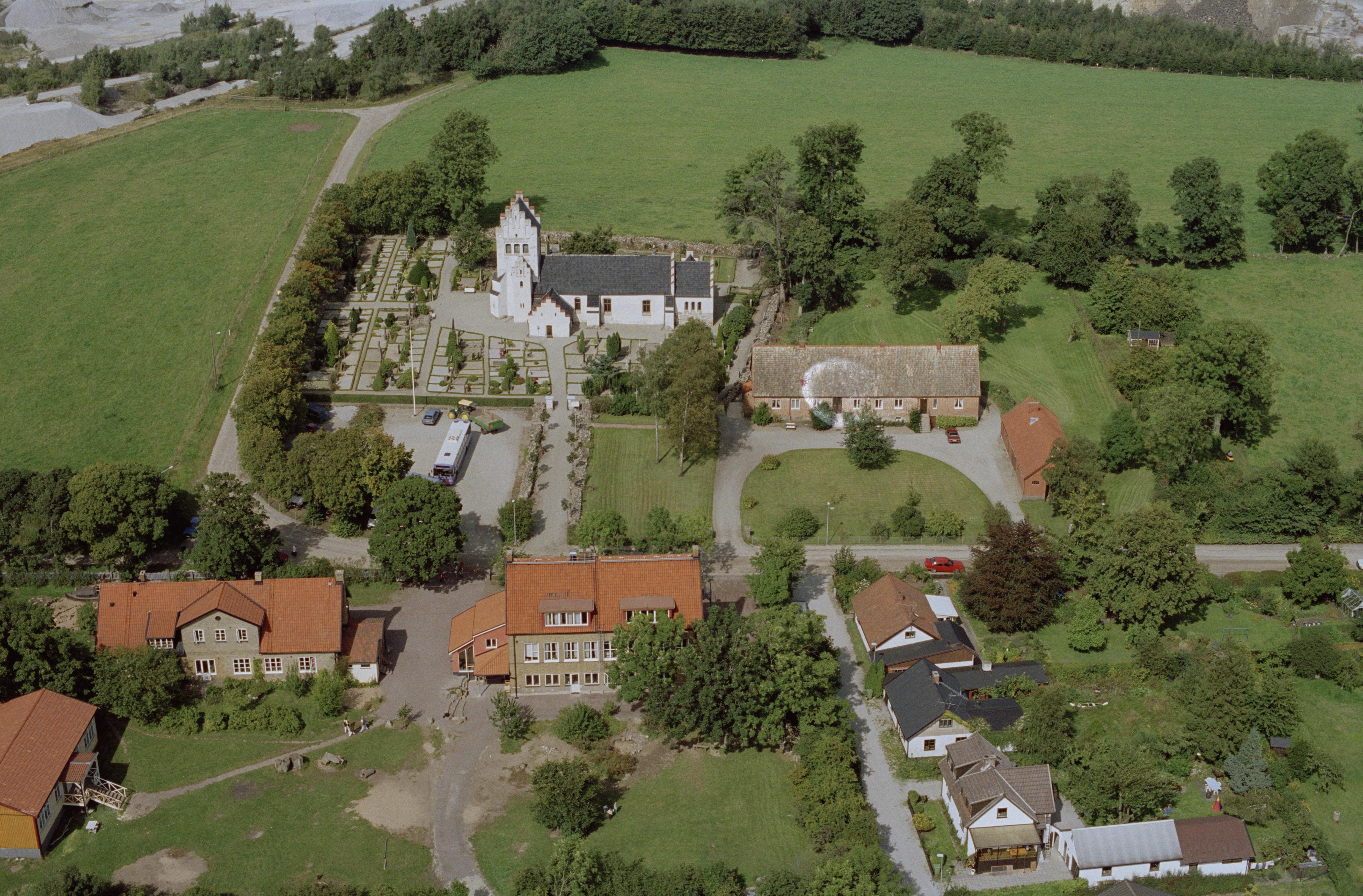 Beskrivning: Hardeberga kyrka och kyrkby. I bildens övre del Norretorp bergtäkt / stenindustri. Bilden är tagen mot (väderstreck): N