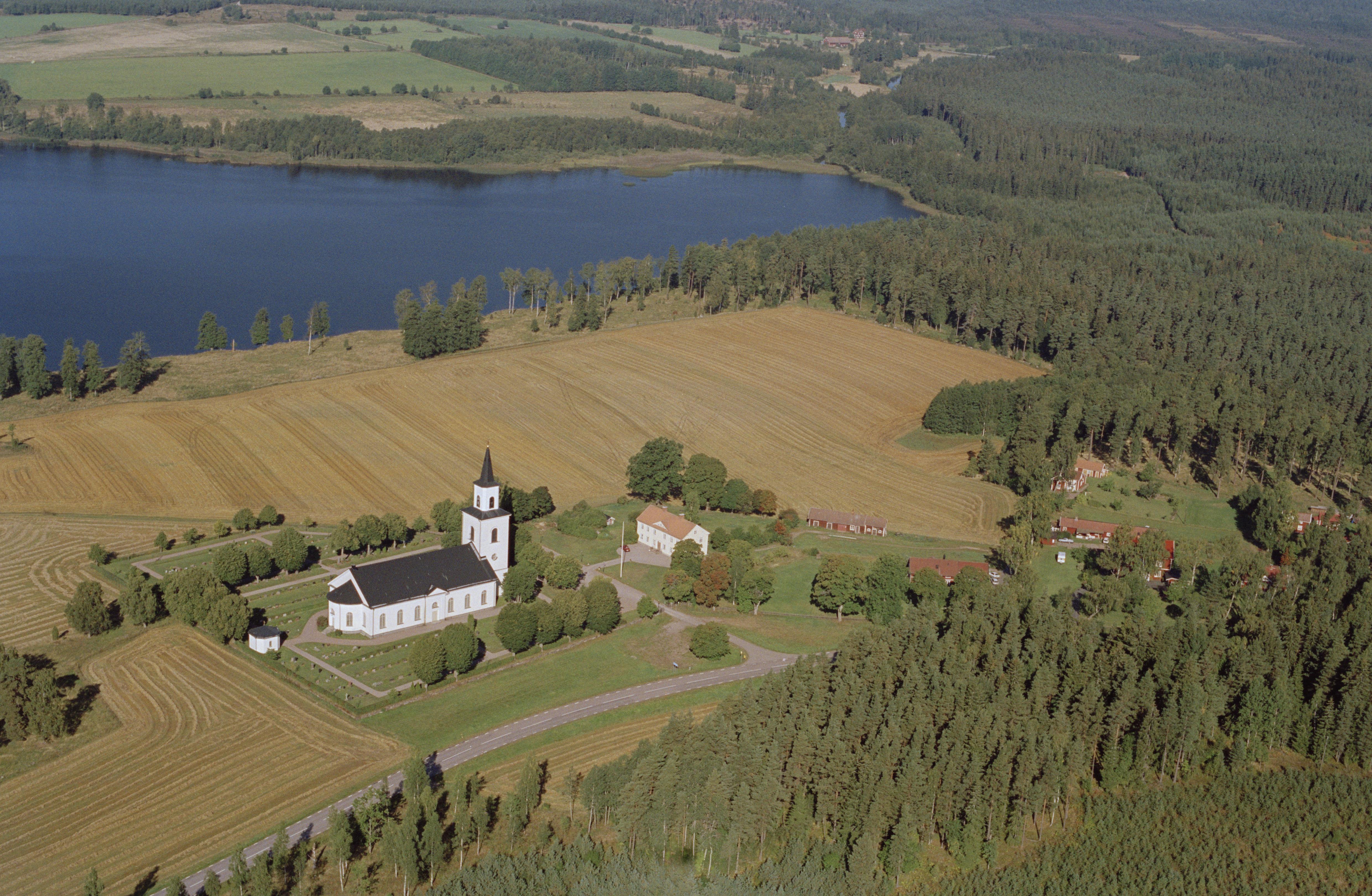 Beskrivning: Flisby kyrka vid Flisbysjön. Bilden är tagen mot (väderstreck): NV