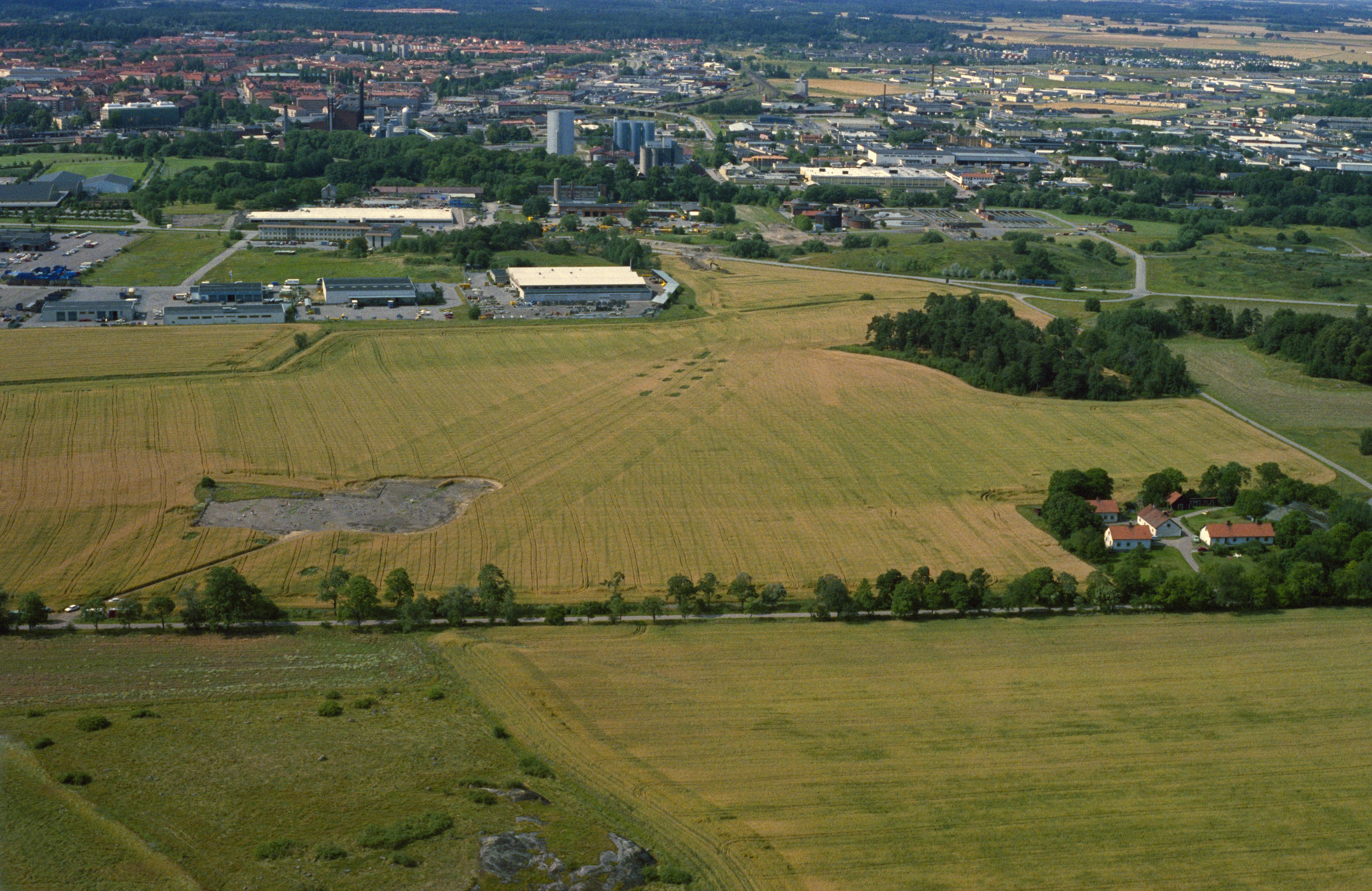 Beskrivning: Linköpings stad. Arkeologisk undersökning (innan vägbygge) vid Mörtlösa i stadsdelen Kallerstad. Boplats och hällristningar Linköping 326:1-3. I bildens övre del gravfält RAÄnr Linköping 140:1 och Linköpings stad. Bilden är tagen mot (väderstreck): V