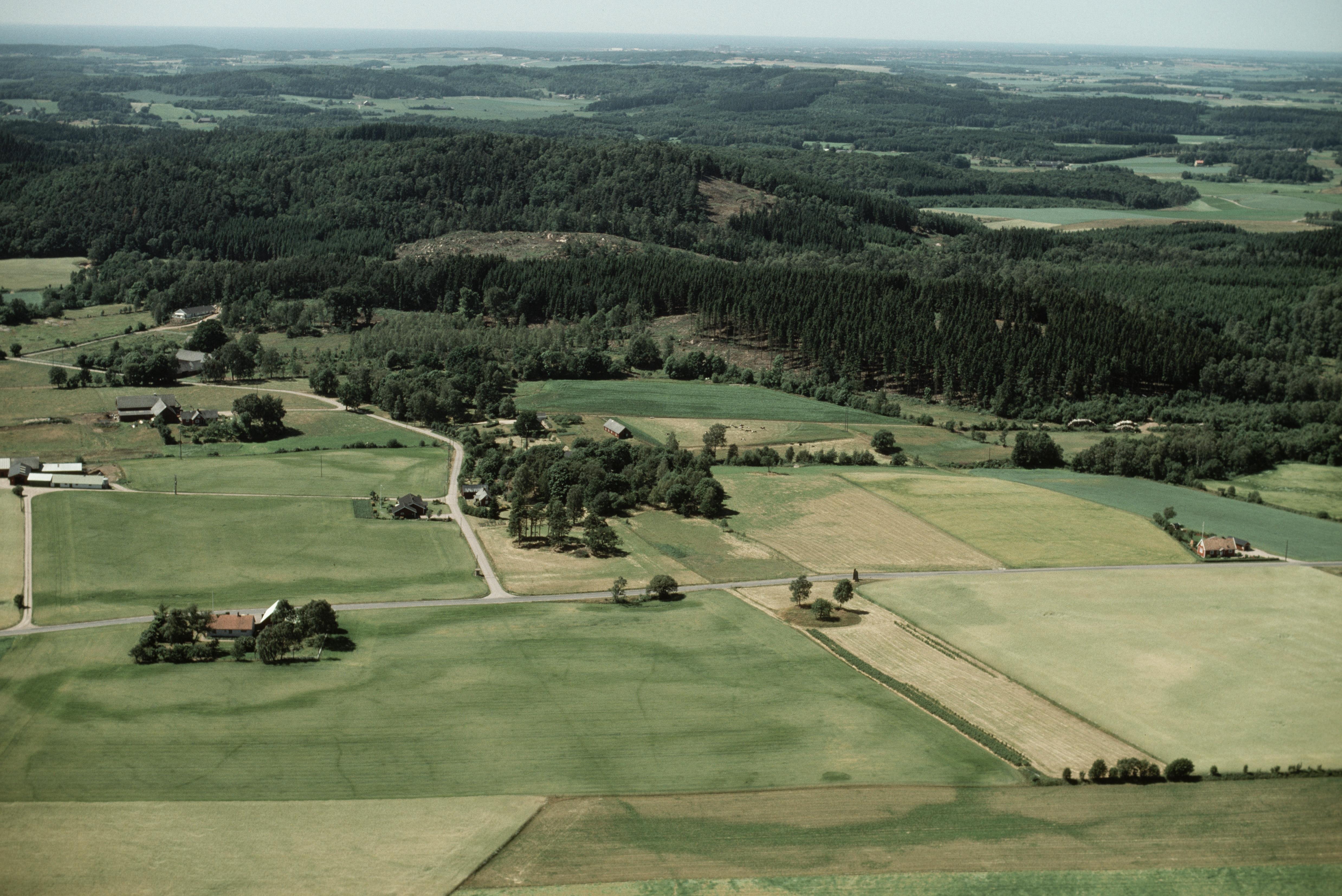 Beskrivning: Fornborg och stensättningen Hagbards stenar / Hagbards galge RAÄnr Asige 17:1 (vid bildens mitt) norr om Asige by. Bilden är tagen mot (väderstreck): V
