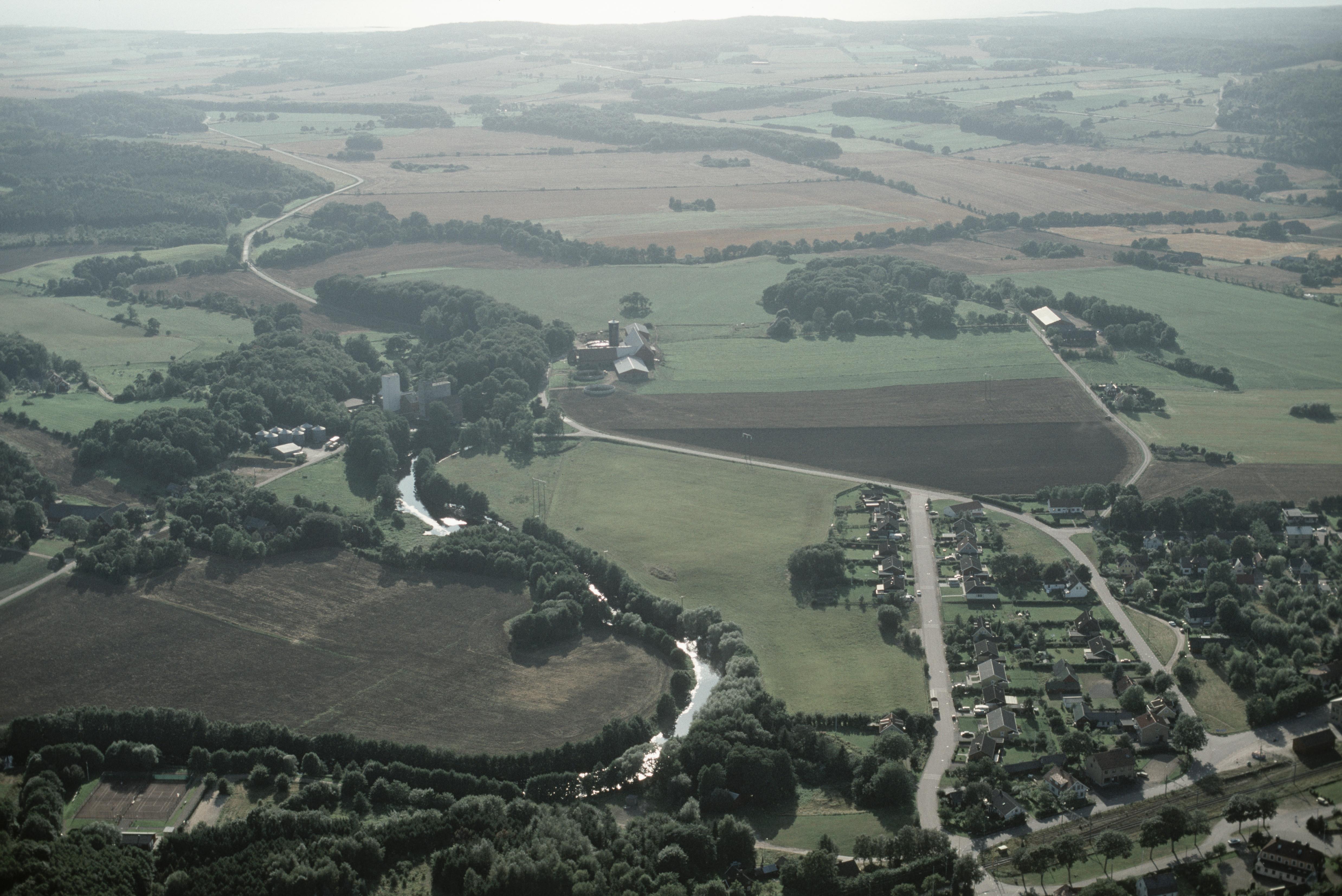 Beskrivning: Innan bygge av väg E6 mellan Laholm och Slöinge. Hög RAÄnr Slöinge 83:1 vid bildens mitt. I bildens övre del Ågård-Bärte i Eftra socken. Bilden är tagen mot (väderstreck): SV