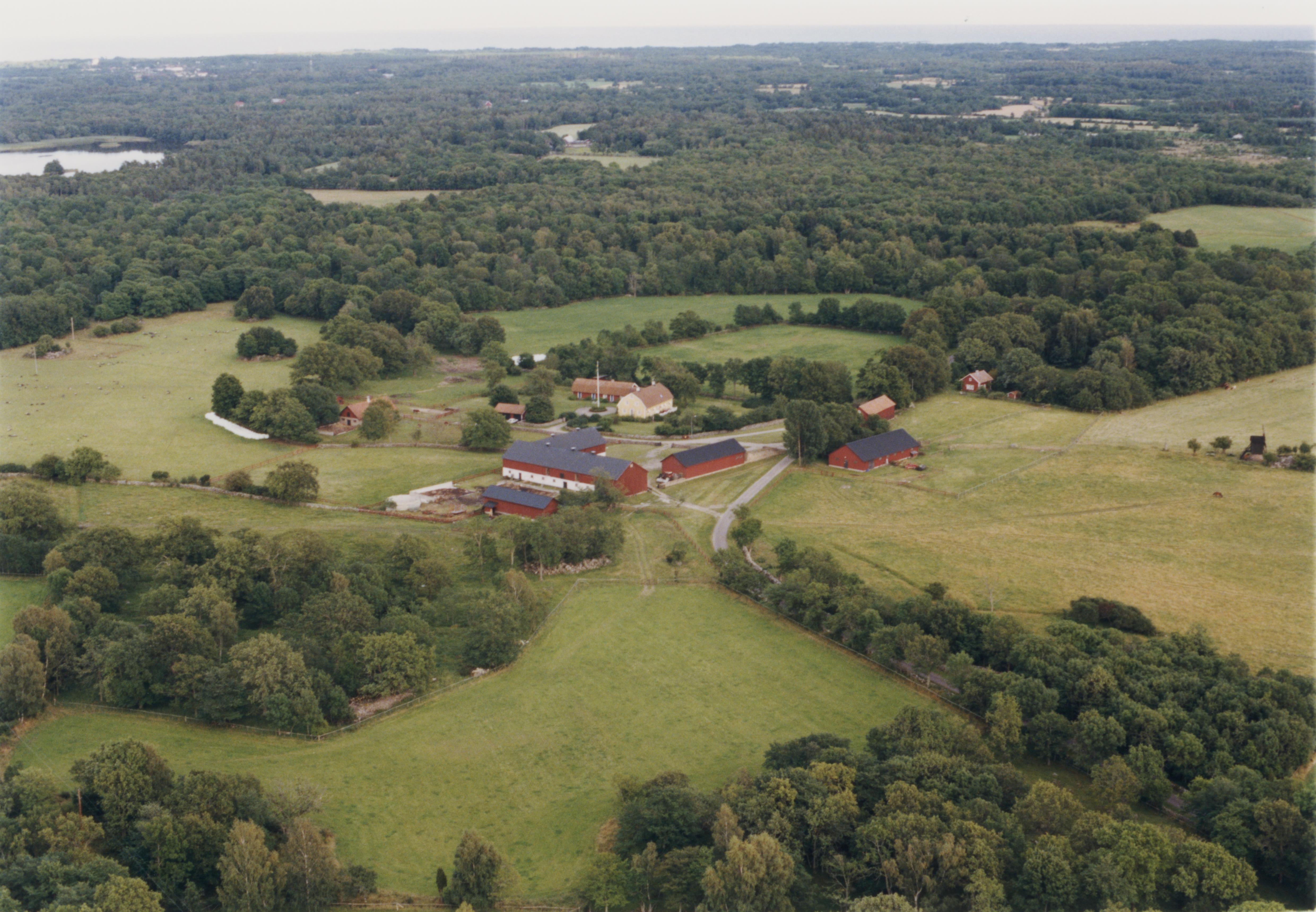 Beskrivning: Horns herrgård / Horns säteri / Horns kungsgård. Över bildens mitt område med hägnad RAÄnr Högby 40:1-2. Bilden är tagen mot (väderstreck): SO