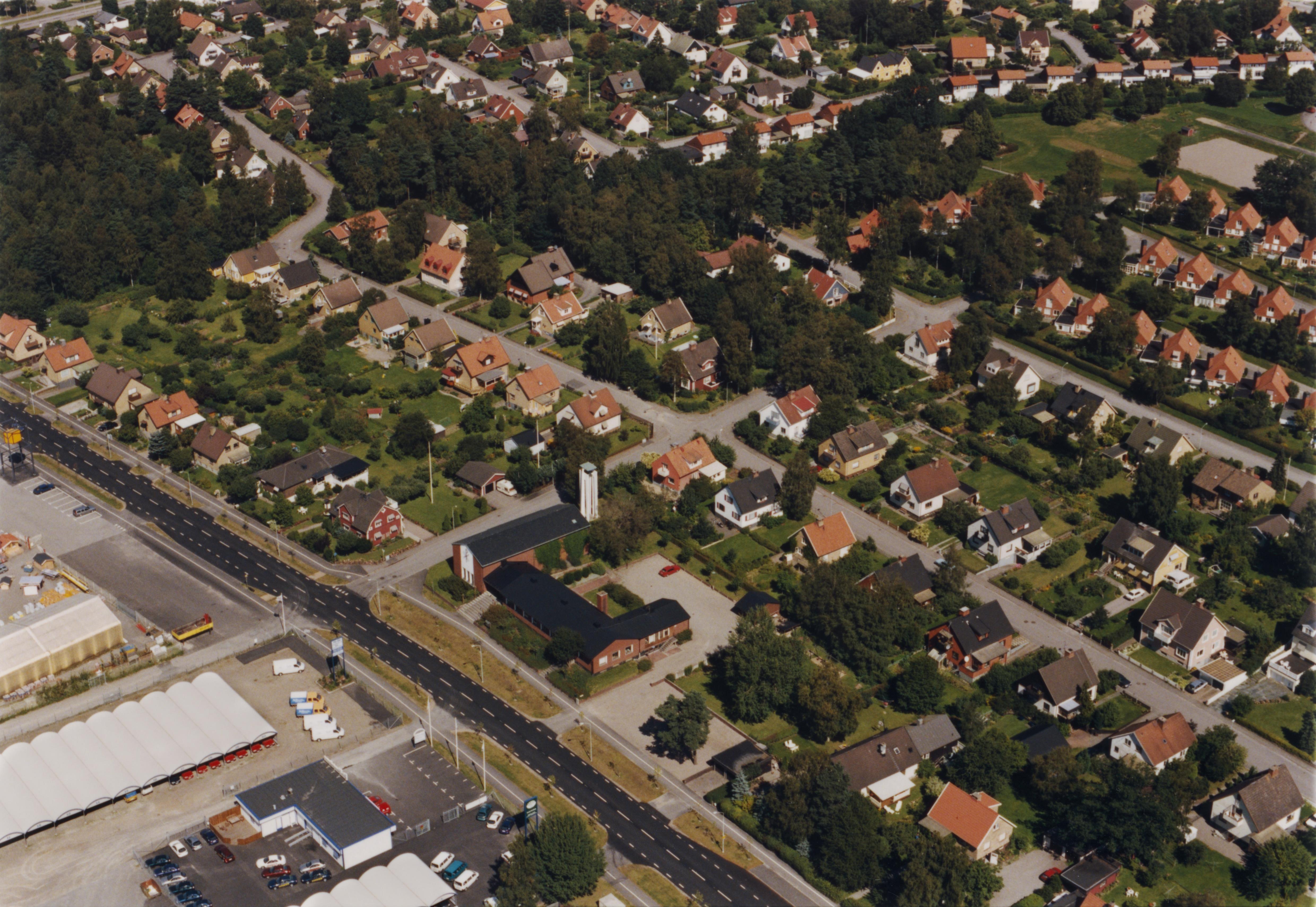 Beskrivning: Stadsdelen Väster i Växjö stad. Västrabo kyrka under bildens mitt. Bilden är tagen mot (väderstreck): NO