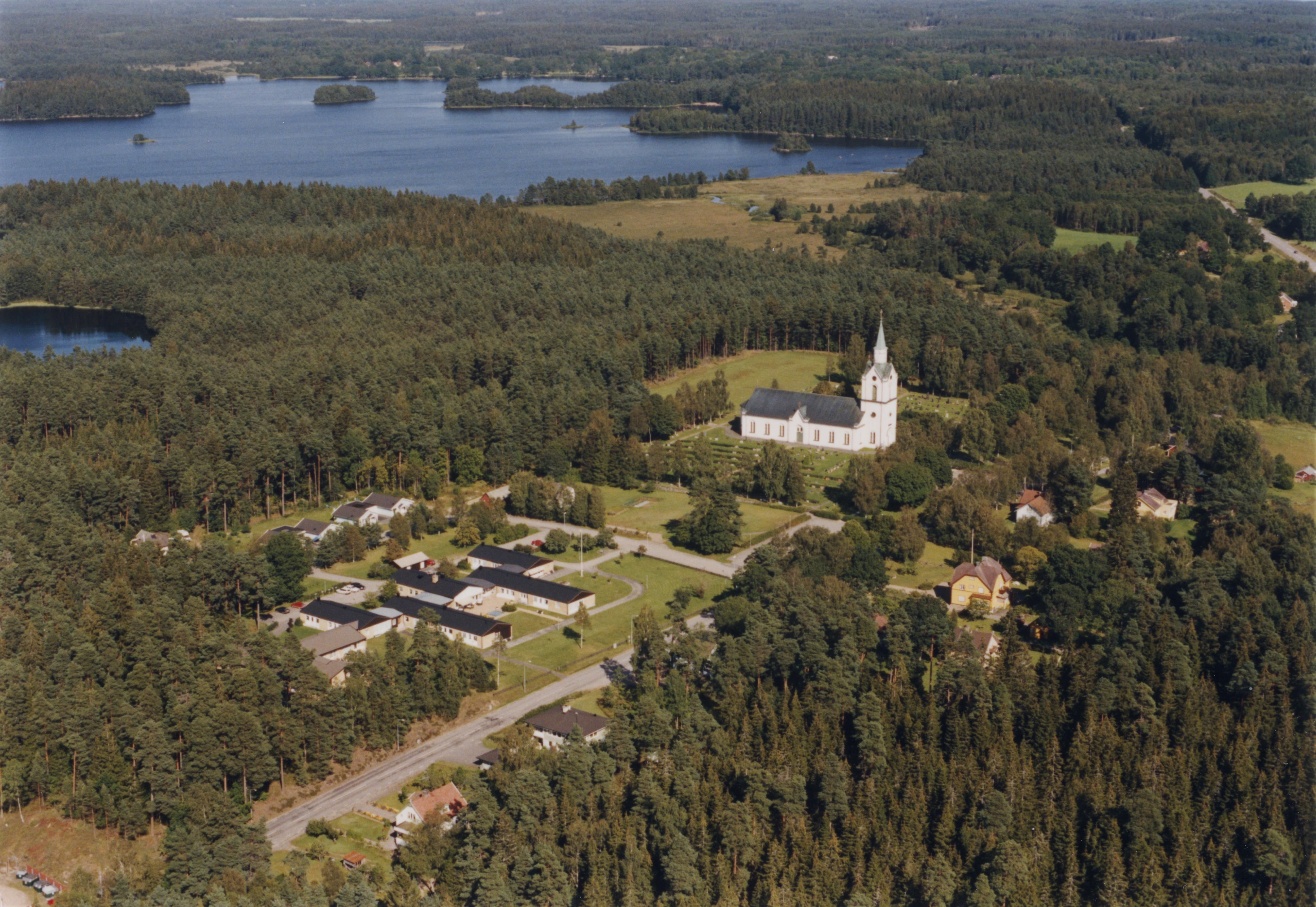 Beskrivning: Göteryds kyrka vid Klockareån och sjön Römningen. Bilden är tagen mot (väderstreck): Ö