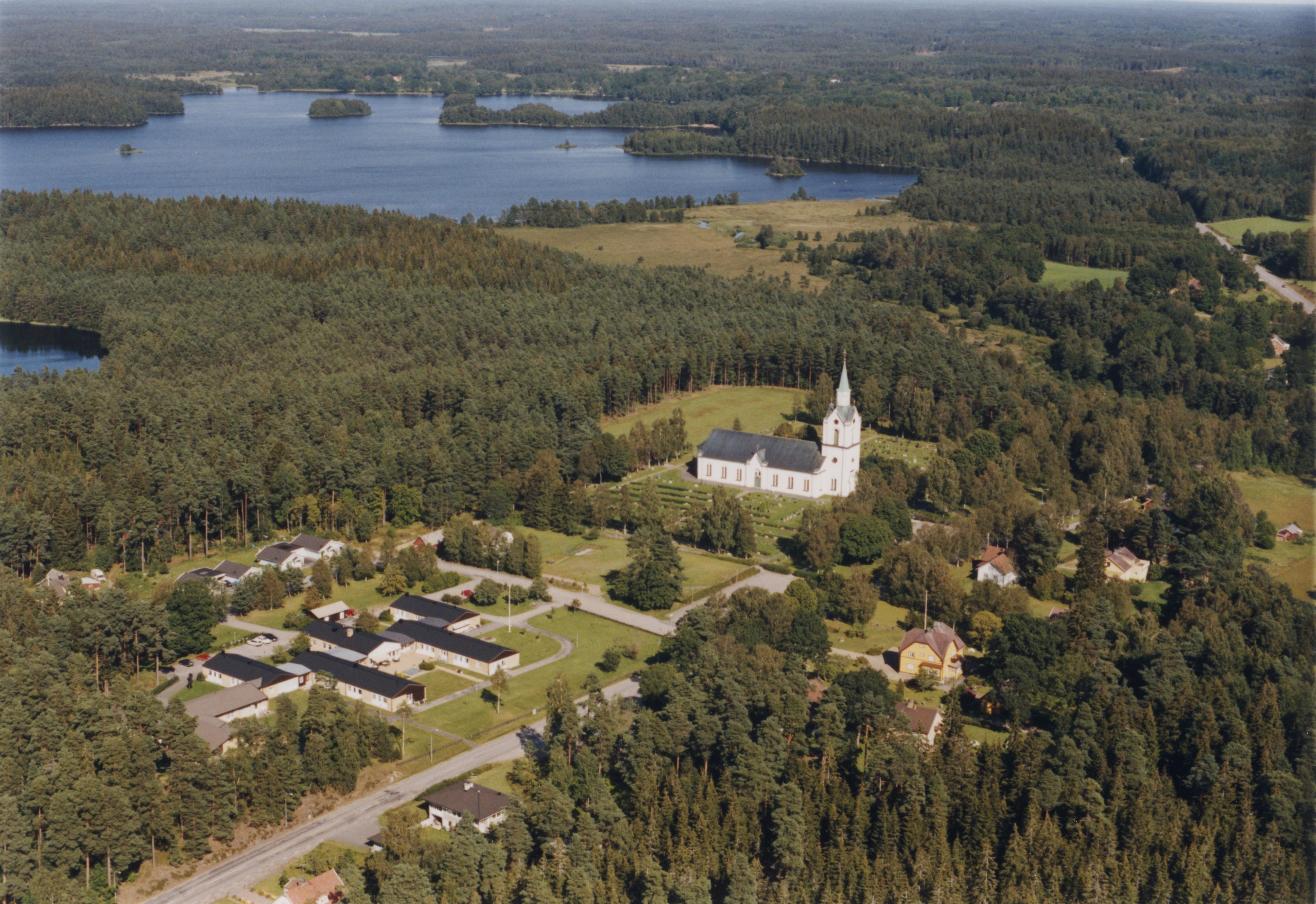 Beskrivning: Göteryds kyrka vid Klockareån och sjön Römningen. Bilden är tagen mot (väderstreck): Ö