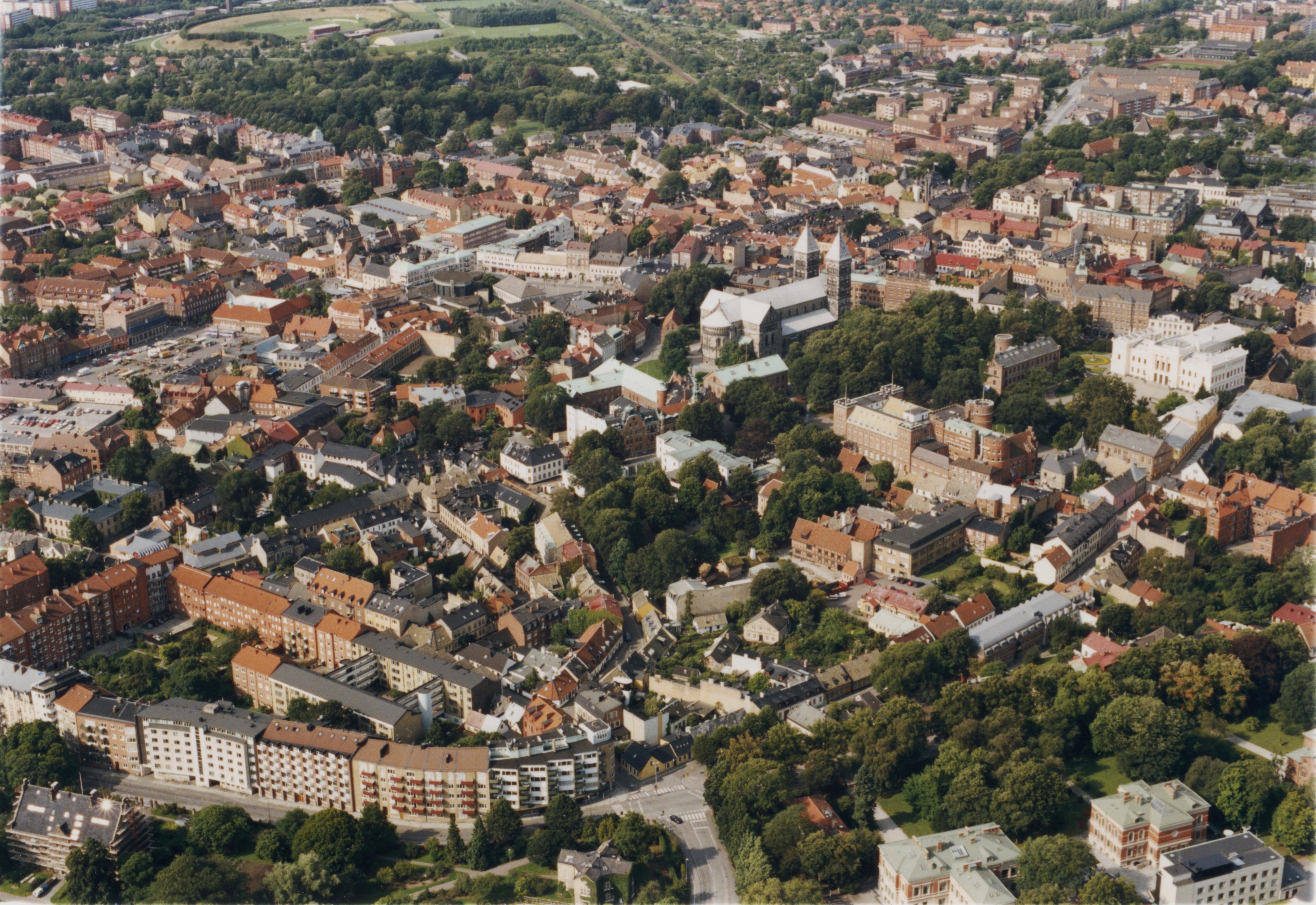 Beskrivning: Lunds stad. Lunds domkyrka vid bildens mitt. Bilden är tagen mot (väderstreck): V