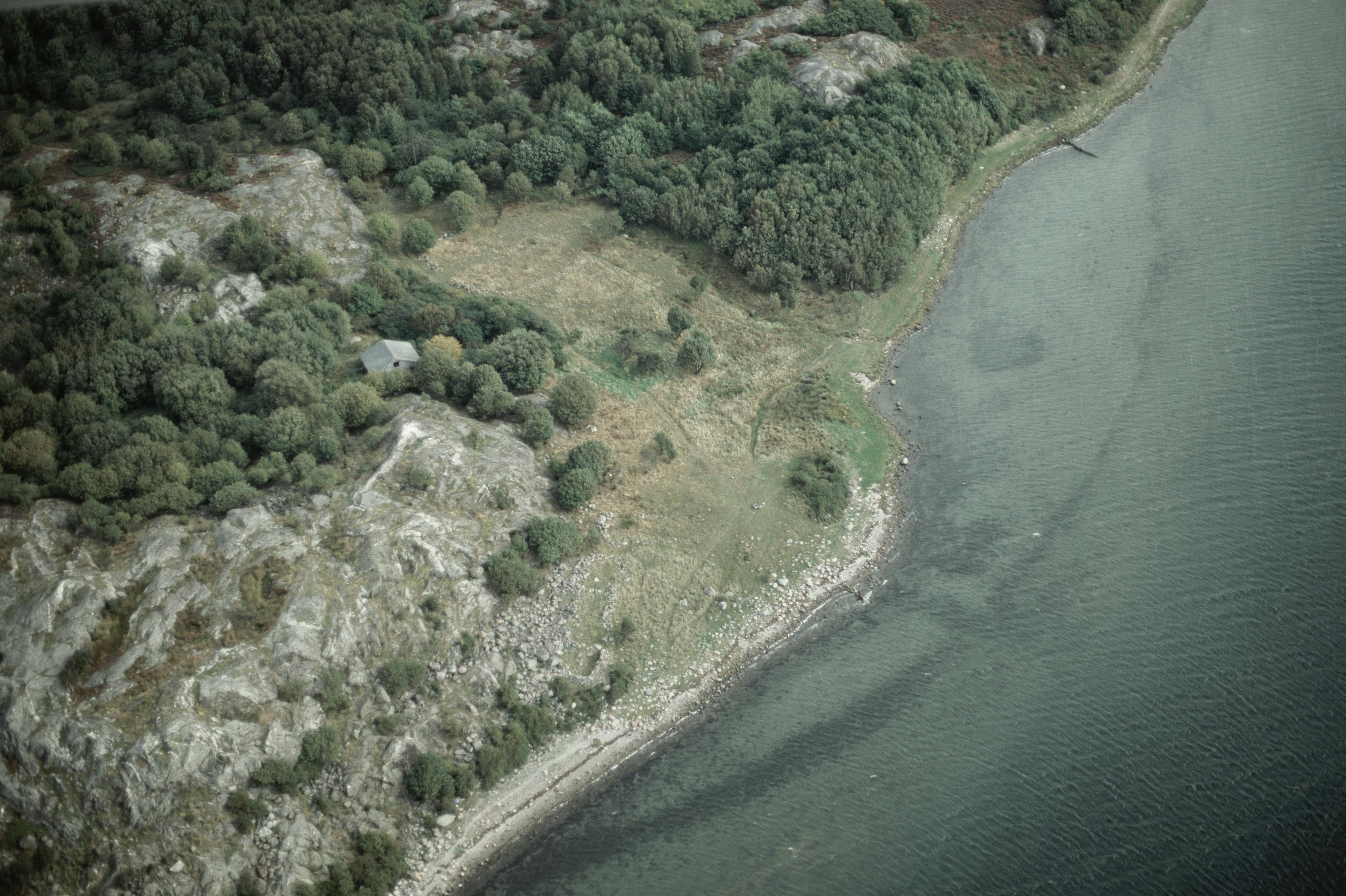 Tomtningar på södra stranden. Fiskelägen RAÄnr Styrsö 38:1 vid bildens mitt och Styrsö 20:1 uppe till höger. Bilden är tagen mot (väderstreck): Ö