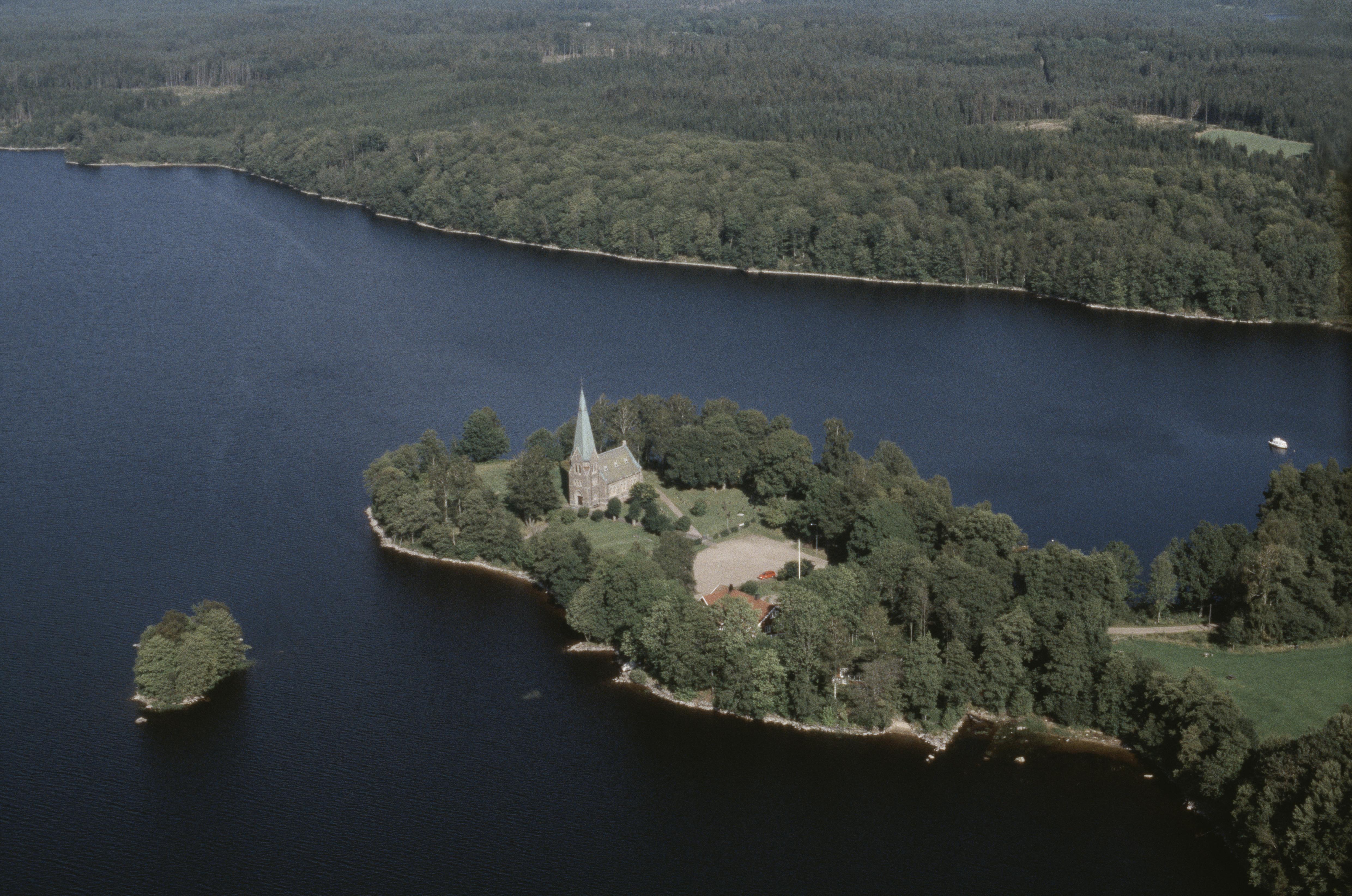 Beskrivning: Sandviks kyrka vid sjön Fegen i Burseryd. Bilden är tagen mot (väderstreck): NO