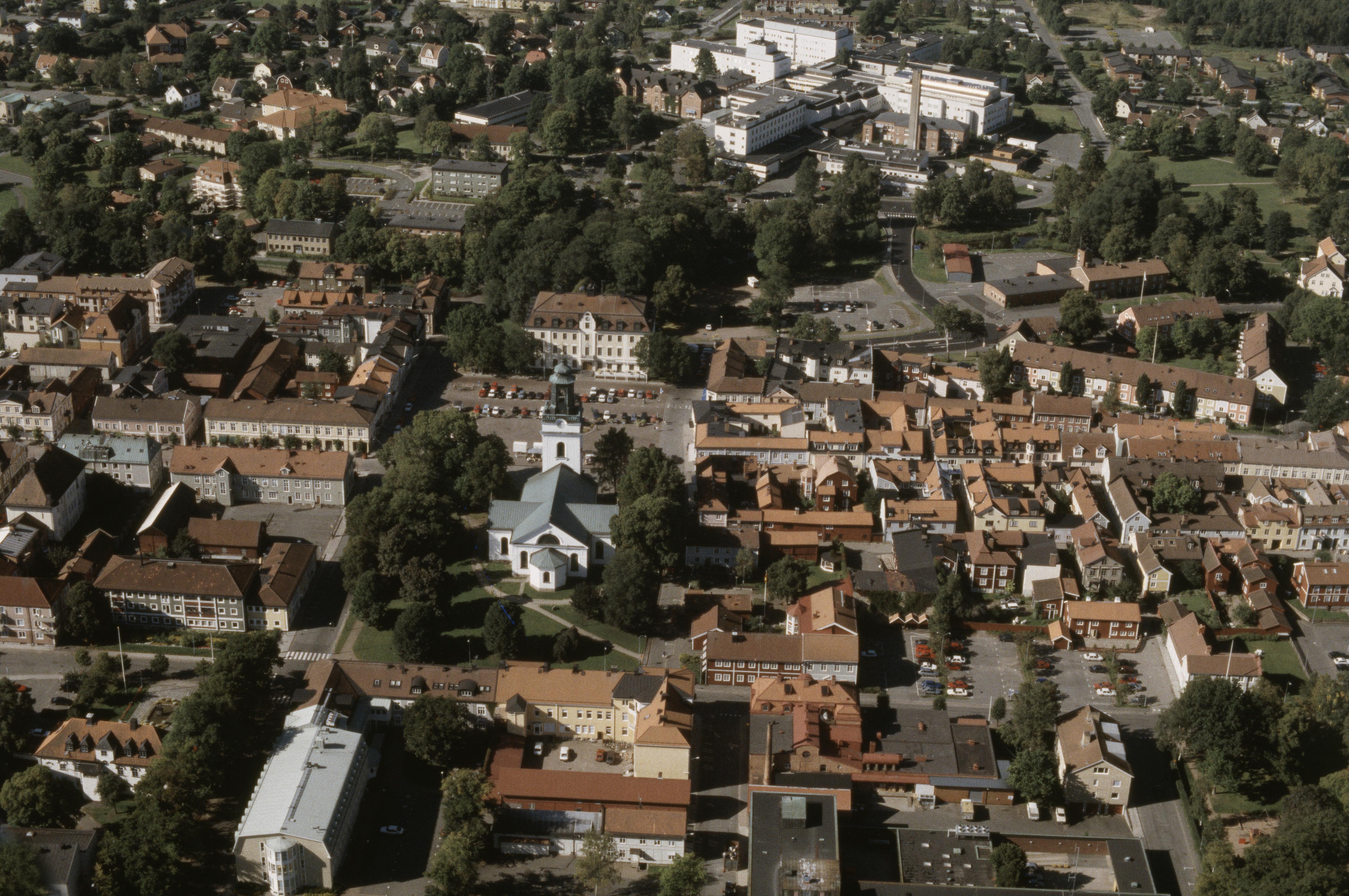 Beskrivning: Eksjö stad. Eksjö kyrka till vänster om bildens mitt. Bilden är tagen mot (väderstreck): SV