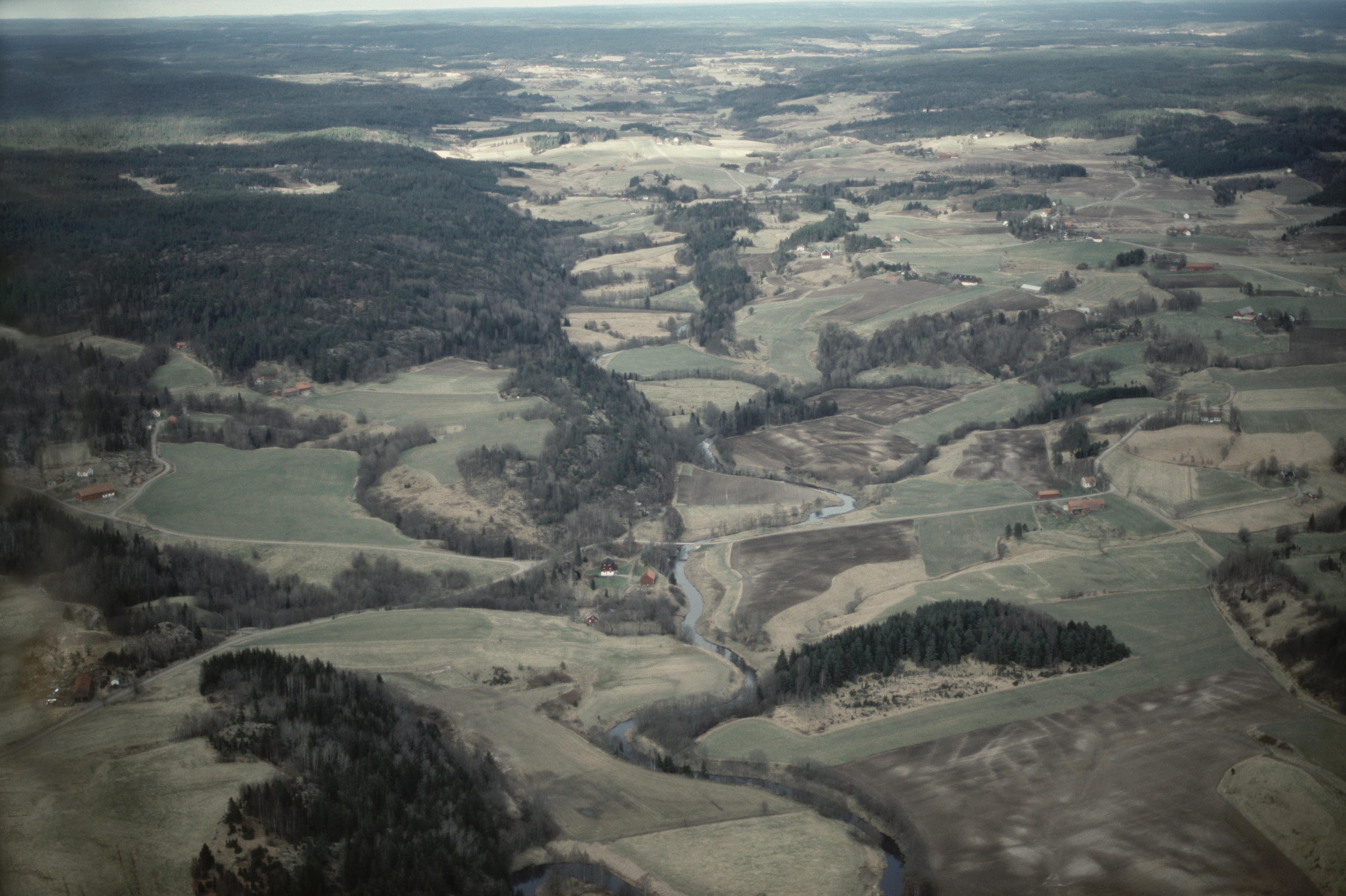 Beskrivning: Örekilsälvens dalgång vid Söbbön mellan Solberg och Sönnerhult. Lämningar av kvarn RAÄnr Krokstad 345:1 m.fl. vid bildens mitt. Bilden är tagen mot (väderstreck): N
