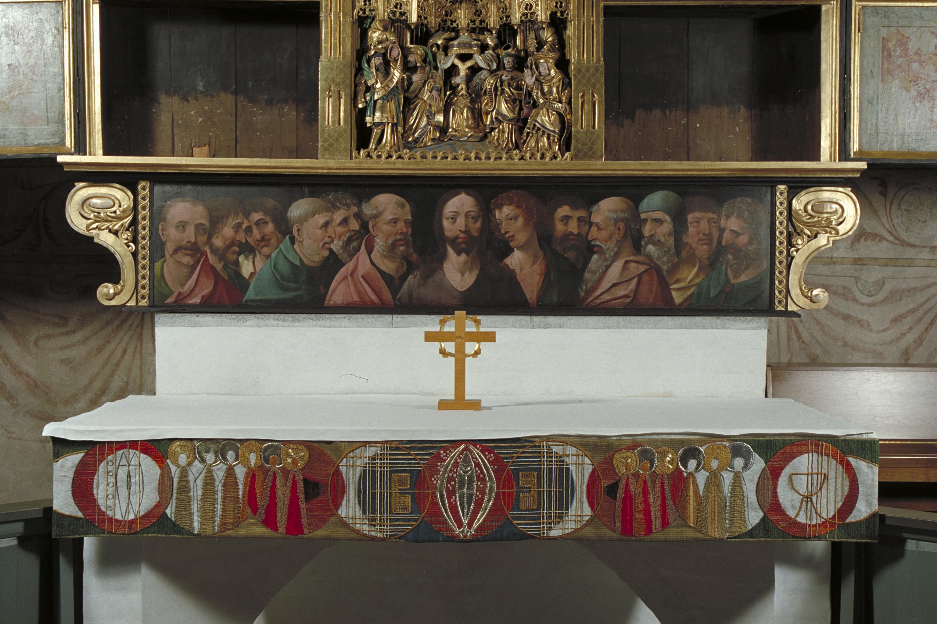 Beskrivning: Altaret med altarbrun och altarskåpets predella.