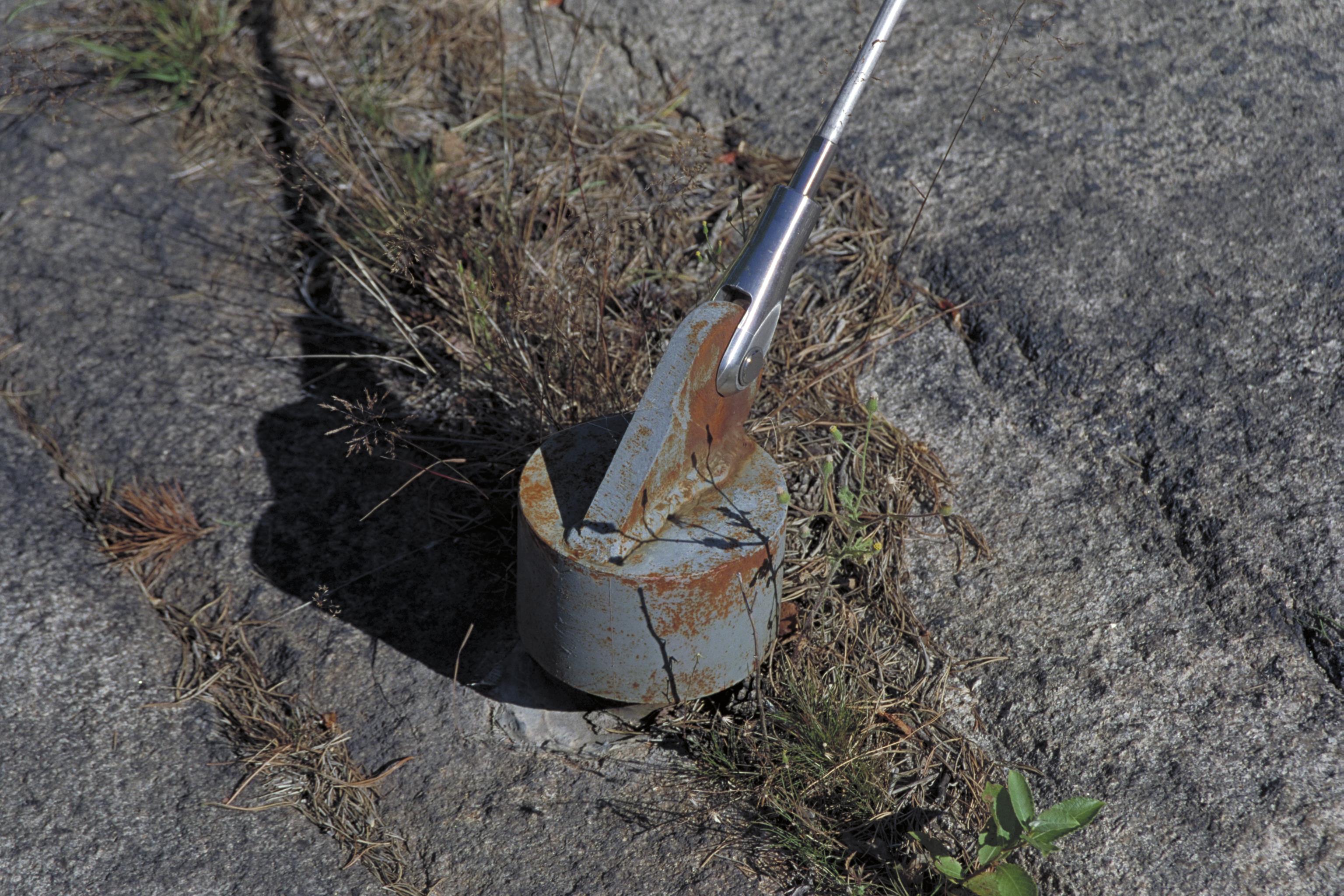 Beskrivning: Detalj av mätinstrument för klimat- och luftföroreringspåverkan vid hällristningslokalen.