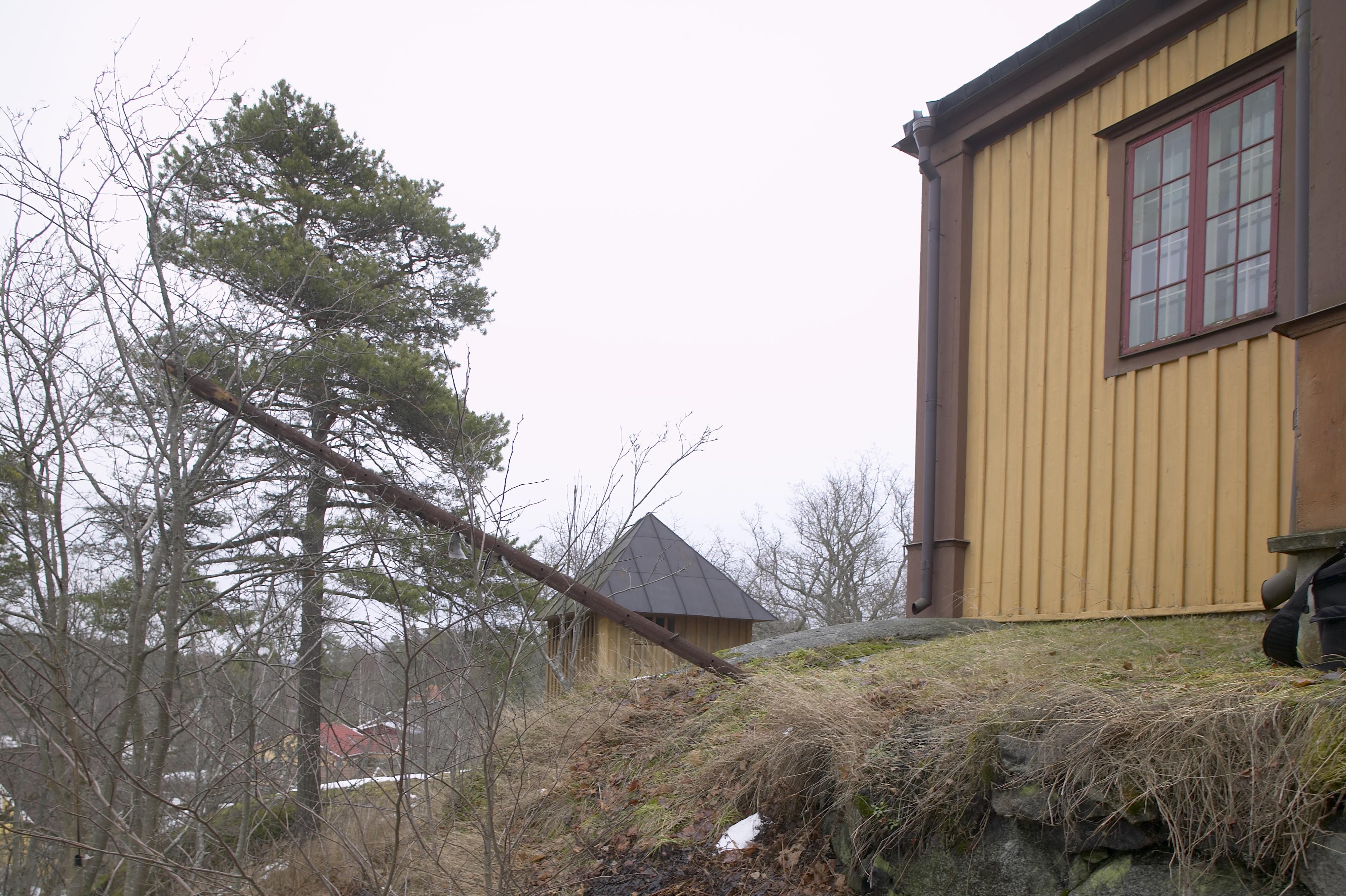 Beskrivning: Del av kyrkan samt förrådsboden norr om den, från nordväst.