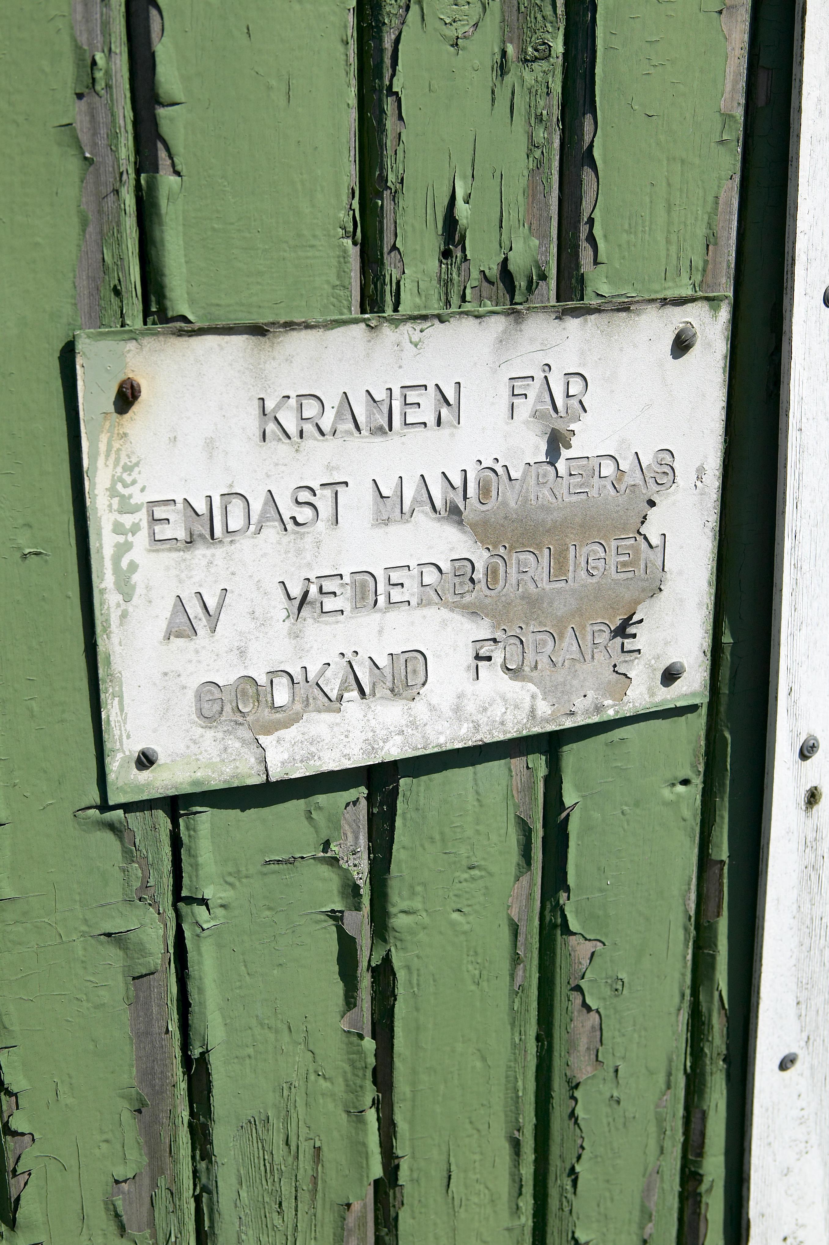 Beskrivning: Ångkran nr 12, skylt som talar om vem som får köra ångkranen.